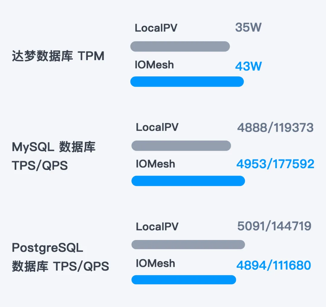 分别创建 32C128G 的达梦数据库集群(主备)、MySQL 数据库集群(主备从)和 PostgreSQL 数据库集群(一主两备),进行标准压力测试,通过 sysbench 压测数据库,验证 Local PV 和 IOMesh 两种存储方案下的数据库性能。结果显示,在达梦数据库、MySQL 数据库和 PostgreSQL 数据库场景下,IOMesh 性能均与 Local PV 非常接近,IOMesh 的性能表现超出用户预期,可充分满足用户使用需求。