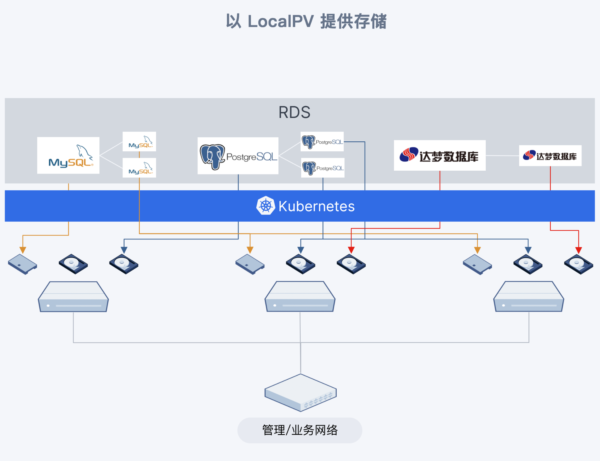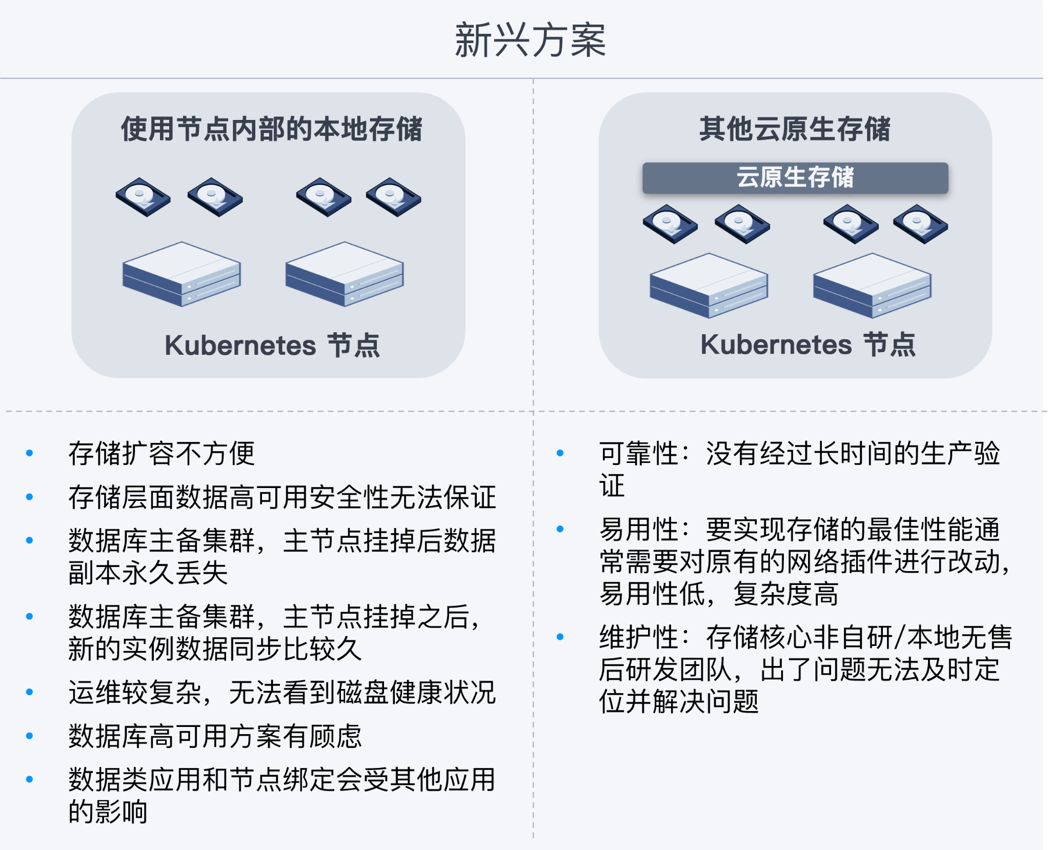 - 使用本地存储 LocalPV:数据冗余保护能力不足,运维较为复杂,但性能高,可满足数据库场景需求。