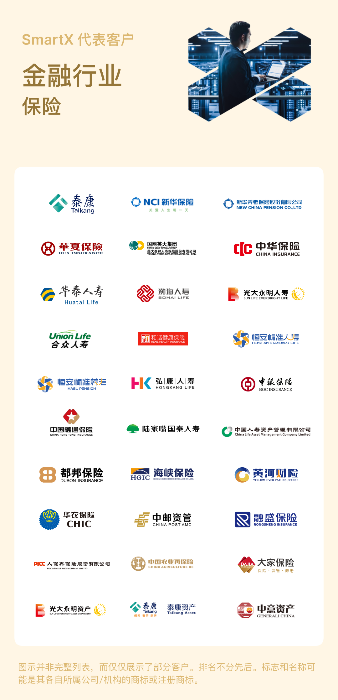 此外,该方案适配海光、鲲鹏等国产 CPU,并已落地诸多金融案例,在保险行业就有某头部保险集团、合众人寿、新华保险、中华联合人寿等。其中,合众人寿分别基于海光、鲲鹏 CPU 服务器部署 SmartX 超融合,构建了“一云双芯”的生产集群架构,内含 SmartX 原生虚拟化 ELF 及 SmartX 自主研发的分布式块存储 ZBS,用于承载 OA 办公、邮件系统,以及达梦、海量生产数据库等等。
