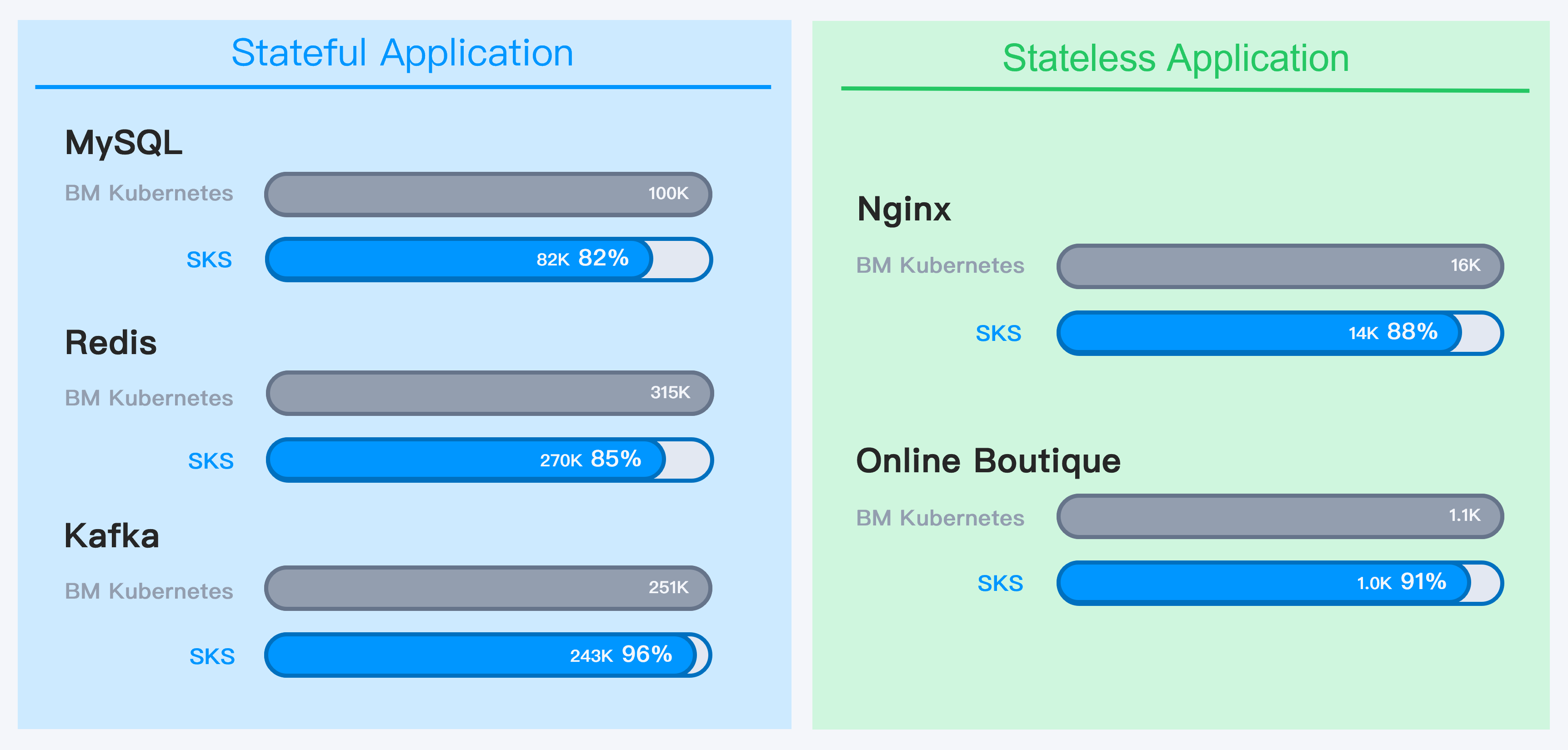 Under the same Kubernetes version, tuning parameters, and application resource configurations, we tested how Kubernetes performs on SKS (deployed on SmartX HCI) and bare metals in the lab environment as well as running stateful and stateless applications. We selected MySQL, Redis, and Kafka for stateful application tests, and Nginx and Online Boutique for stateless application tests.
