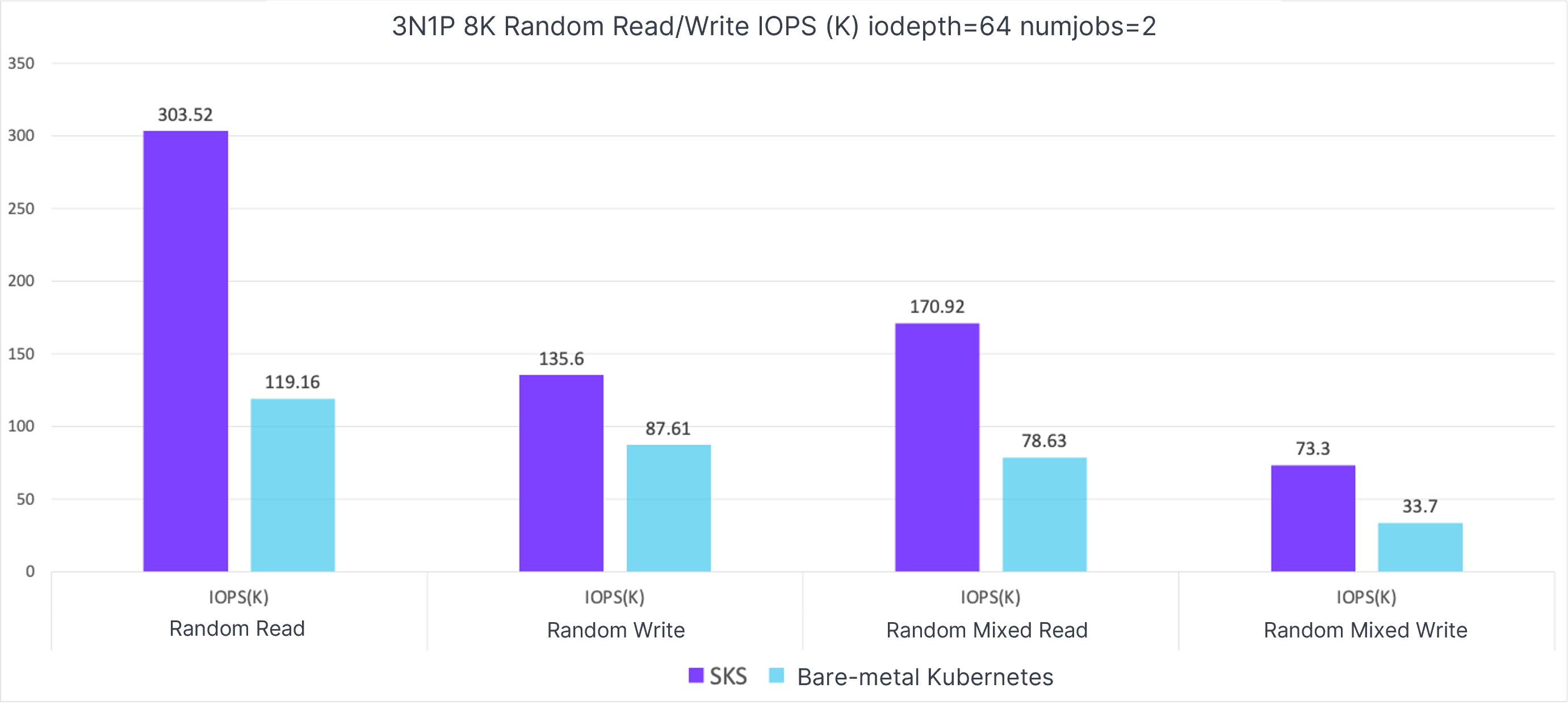 We conducted FIO stress tests in both environments. The results showed that SKS outperformed bare-metal Kubernetes, probably due to the I/O localization feature of SmartX HCI.