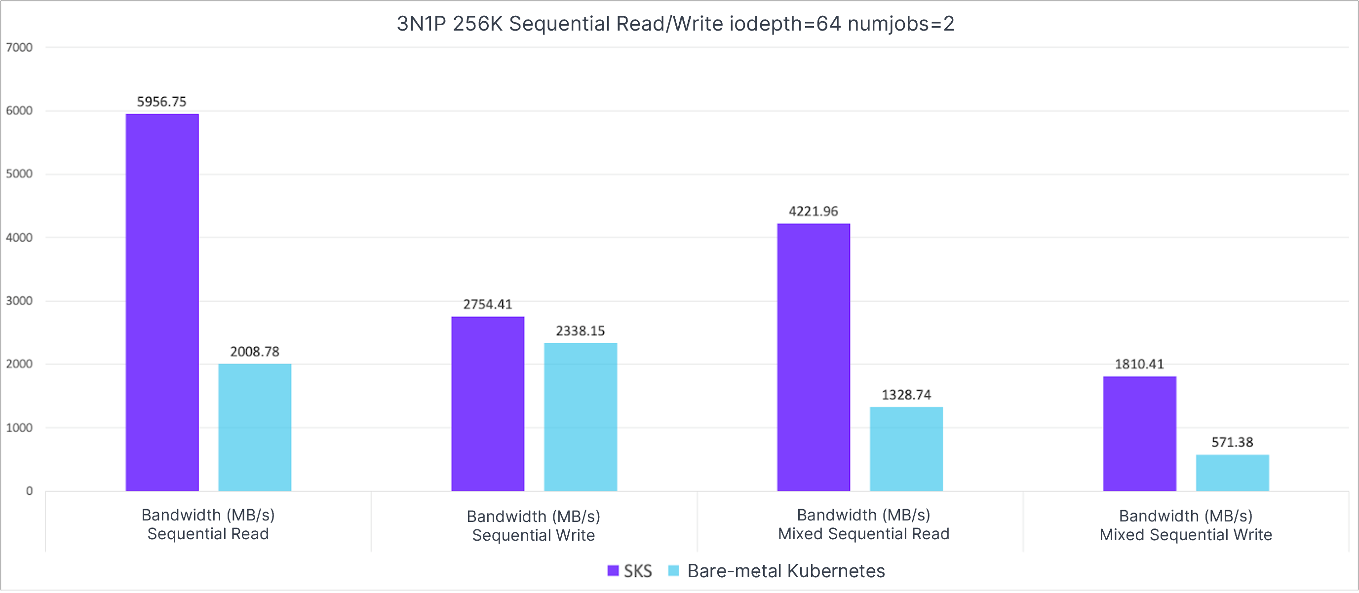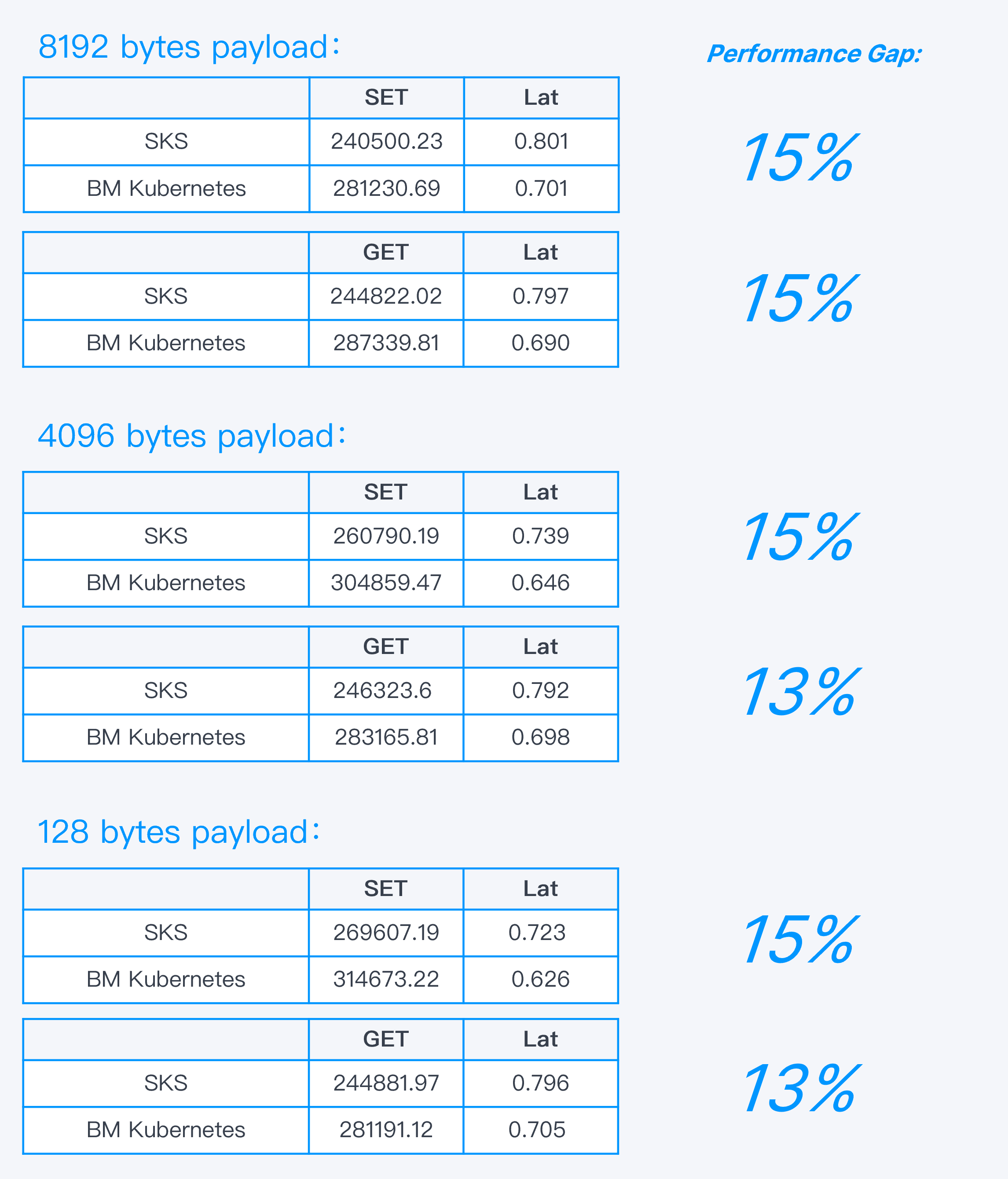 In general, SKS demonstrates a remarkable performance level, achieving between 82% and 96% of the performance observed in bare-metal Kubernetes deployments. Particularly in common business scenarios, SKS and bare-metal Kubernetes exhibit nearly identical performance, highlighting SKS’s ability to meet the performance requirements of the majority of containerized applications. Specifically: