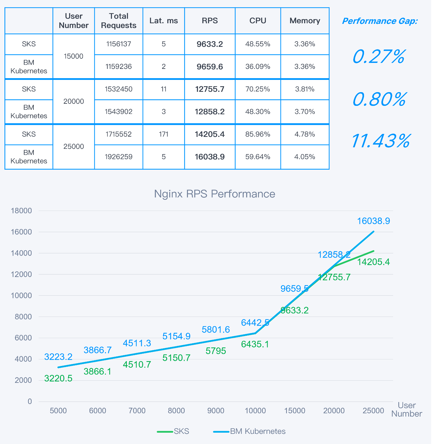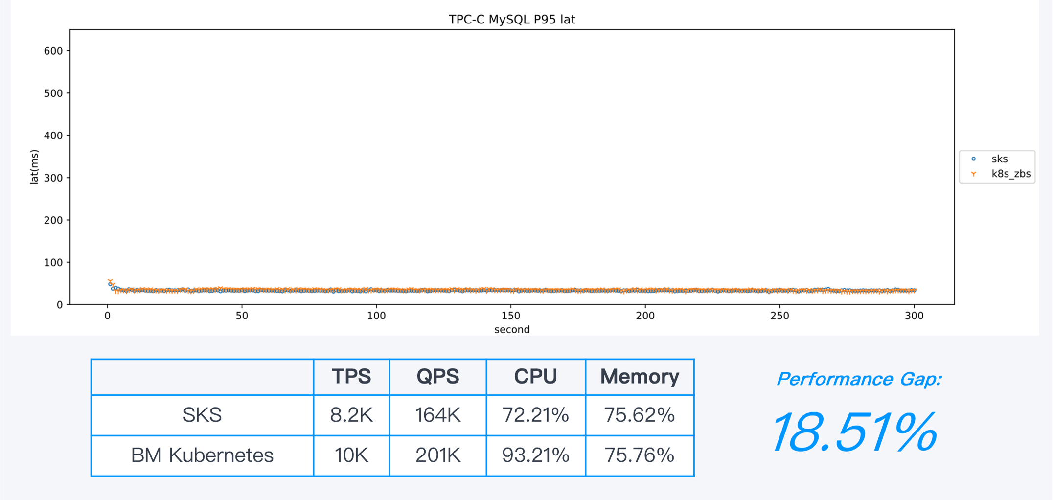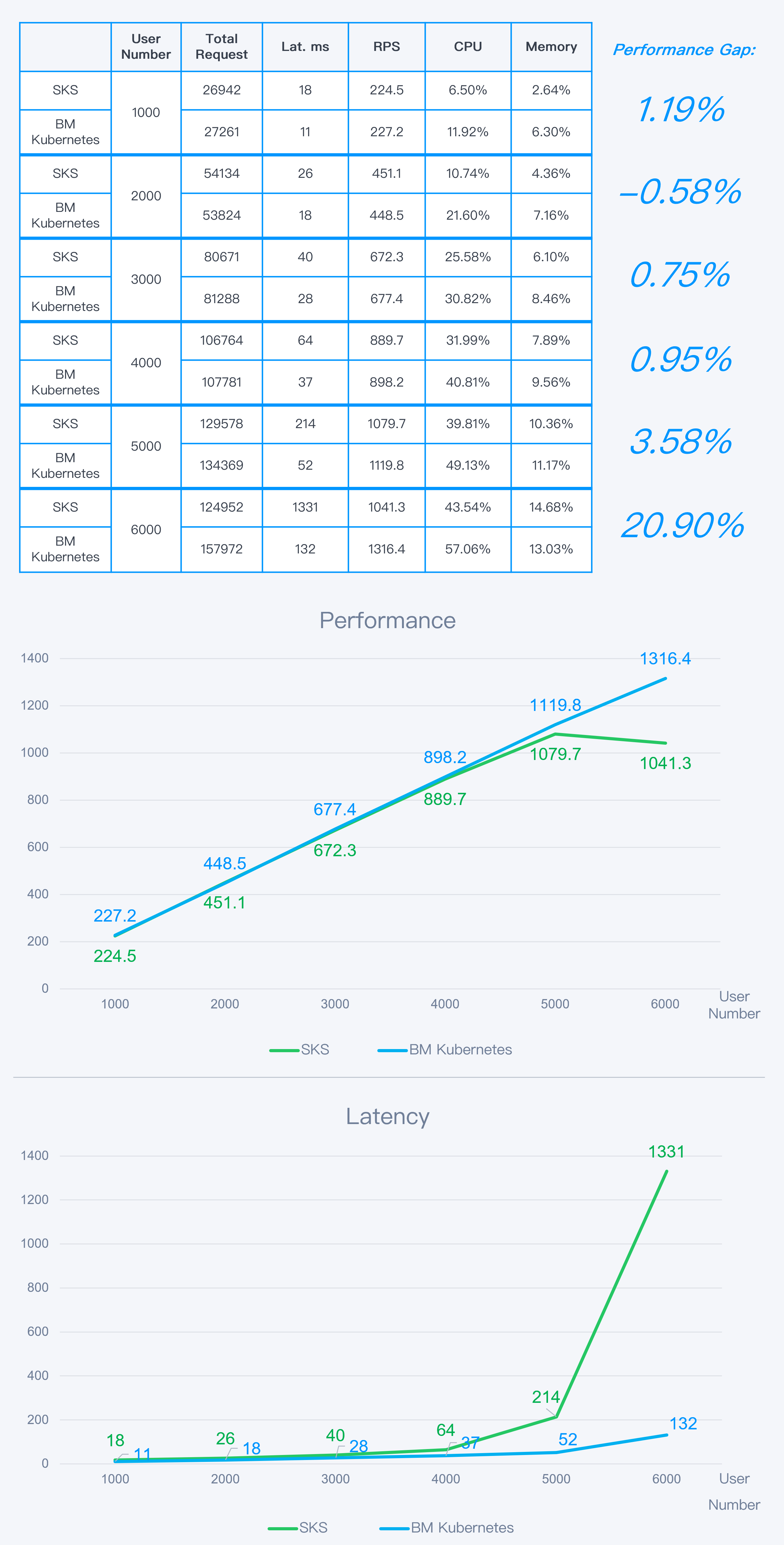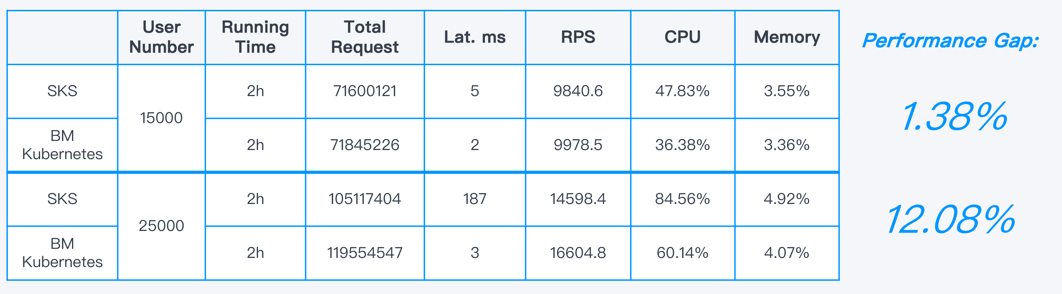 After continuous running, with 25,000 concurrent users, the performance gap between SKS and bare-metal Kubernetes was around 12%.