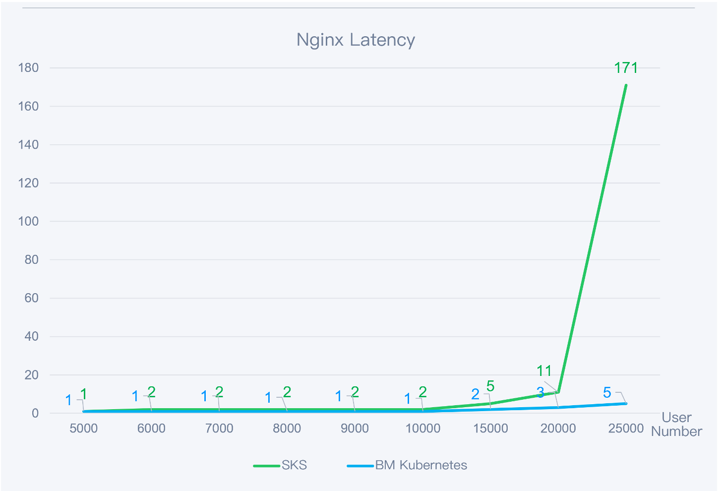 With less than 20,000 concurrent users, the performance gap between SKS and bare-metal Kubernetes was less than 1%.