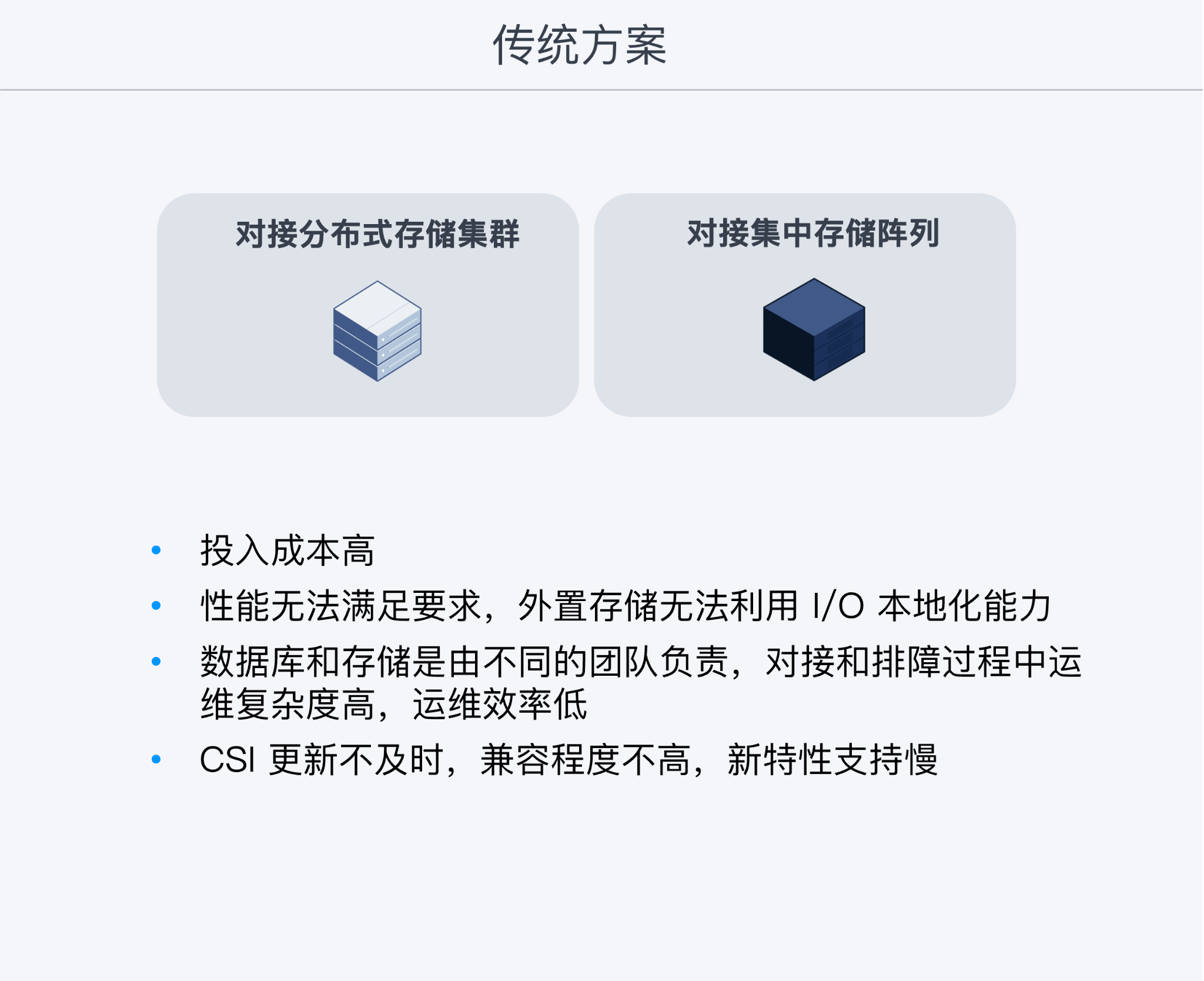 传统方案:以 RDS 数据库对接既有分布式存储集群和集中式存储集群。但该方案由于性能低、成本高、运维效率低等问题,在首轮评估时遭到放弃。