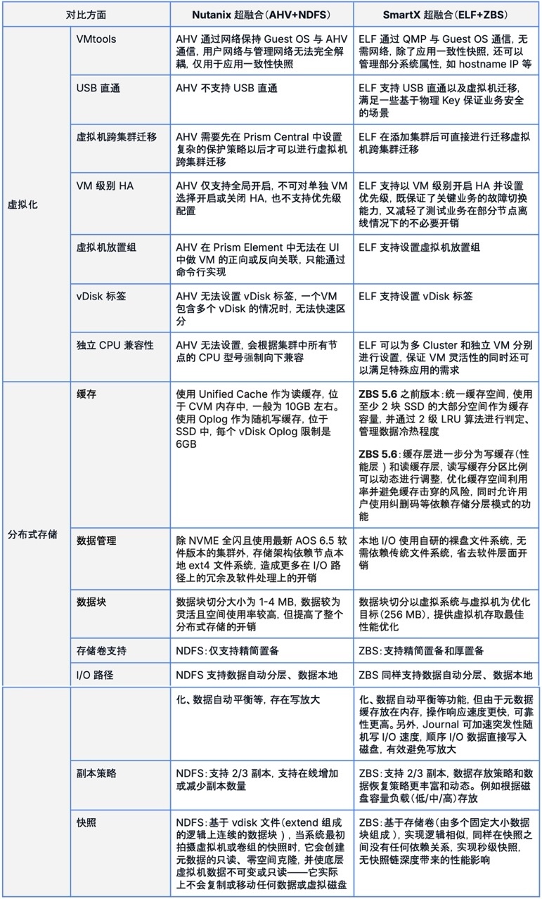 而对于核心超融合软件,在虚拟化层面,SmartX 超融合原生虚拟化 ELF 和 Nutanix 虚拟化 AHV 都基于 KVM 开发,两者能力相当,而 SmartX ELF 虚拟化基于国内用户的使用习惯进行了很多功能优化;在分布式存储层面,SmartX 自研分布式存储 ZBS 在元数据服务、数据块大小、存储卷支持、I/O 路径、数据冗余机制等方面都进行了改进,使得 SmartX 超融合能够提供更优于 Nutanix 超融合的性能和稳定性,更好地满足大型数据库等应用场景的性能需求。