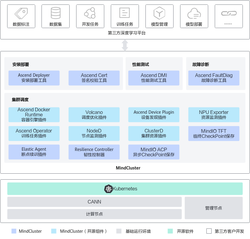 - 部署 MindCluster 组件:昇腾提供的 MindCluster 组件包包含基础必选模块和扩展可选模块,用户可根据实际业务需求选择安装。