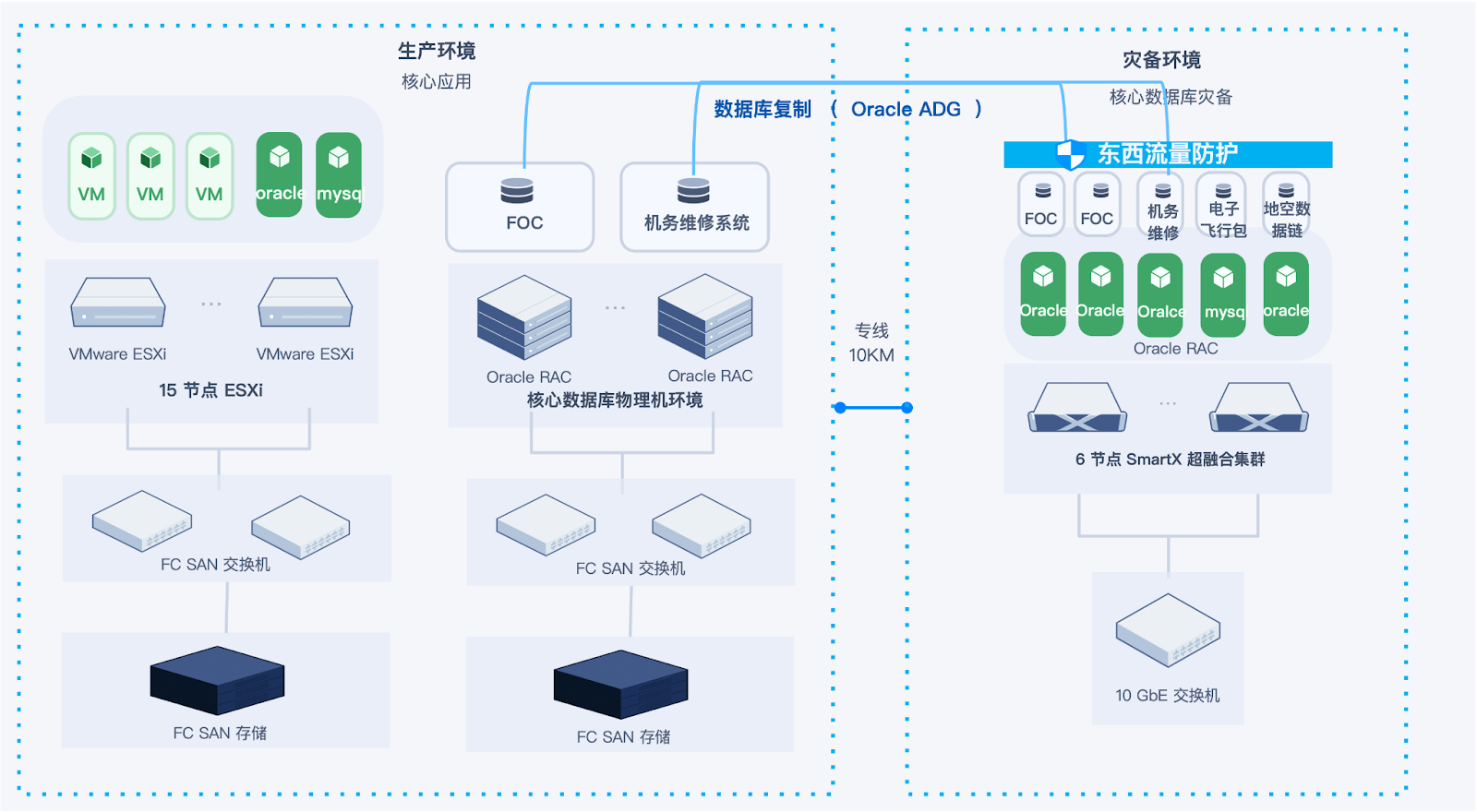 某区域型航空公司原采用“VMware 虚拟化 + FC SAN 存储”架构承载大部分业务系统,FOC(航空运行管理)、机务维修等重要系统及其数据库则部署在物理机 Oracle RAC 环境。