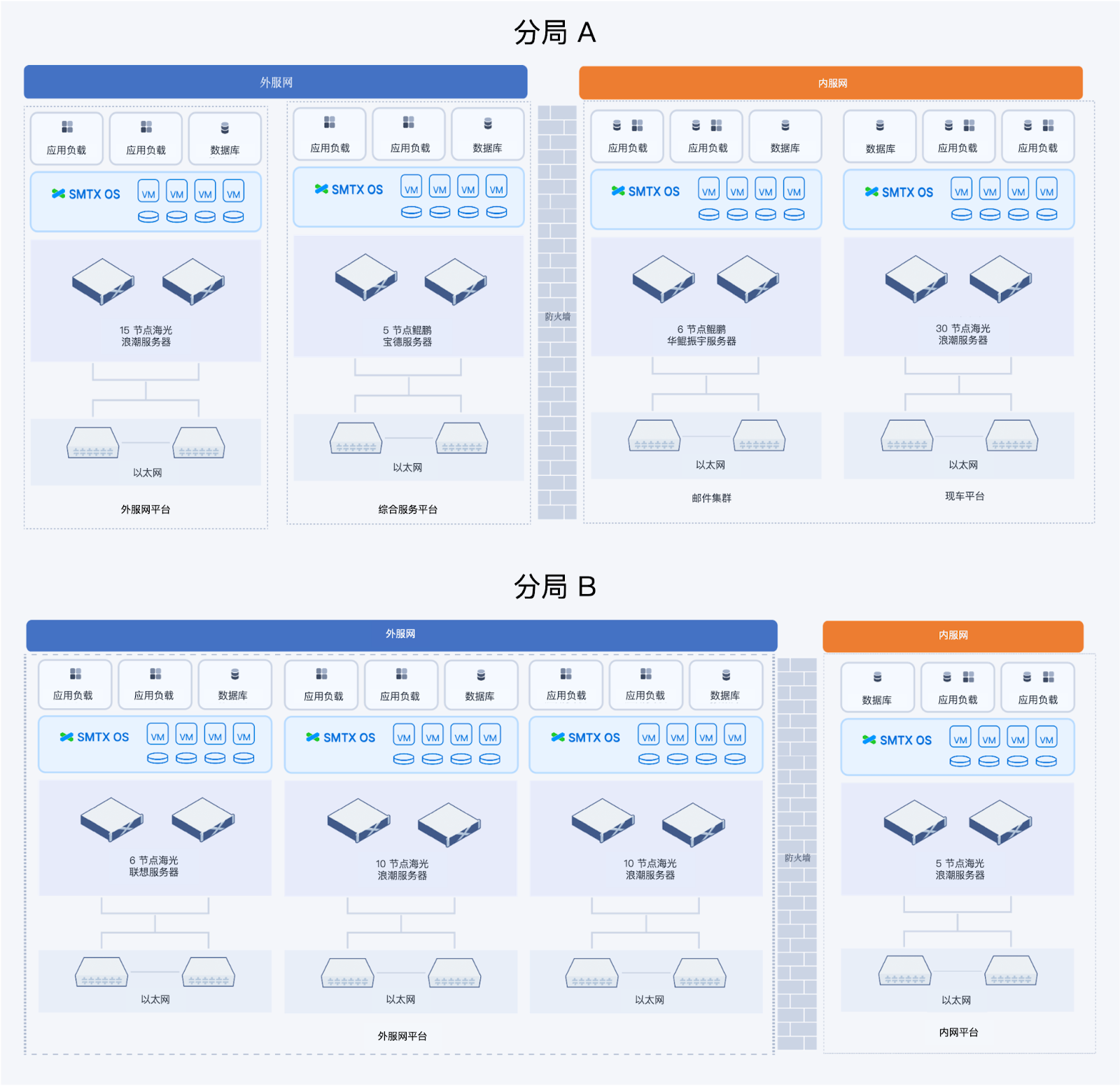 - 分局 A:于内外网分别部署 30+ 和 20+ SmartX 超融合信创节点(基于海光和鲲鹏异构 CPU 架构),支持内网的现车和邮件系统,以及外网的综合服务平台。