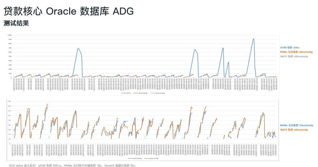 在前述集群稳定运行近 4 年后,用户进一步针对 SmartX 企业云平台在核心贷款数据库场景的支撑能力进行了验证。在生产核心贷款数据库环境,一套核心数据库的三套 ADG 备库同时监控 ADG Apply Delay(应用延迟)。用户在日结批大数据量跑批场景下,基于 SmartX 企业云平台部署并分别记录三套 ADG 对比主库的延迟情况*。