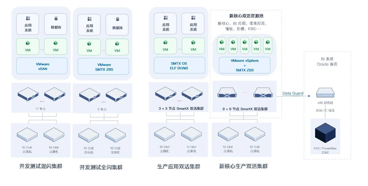 从 21 年开始,用户陆续在生产环境中配置了 10 节点和 7 节点的两个 SMTX OS 集群(采用原生的 ELF 虚拟化),承载了除核心账务系统数据库之外全部 100+ 生产业务系统的 MySQL 数据库从库并稳定运行,支撑的业务系统包括电子票据、企业网银、账户系统、风险管理系统、核心柜面系统、个人信贷、指纹认证、智能营销平台、统一收单、人脸识别等。