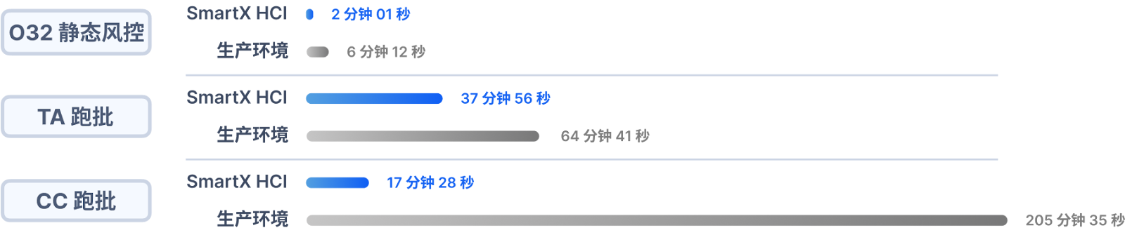 通过多轮性能测试,SmartX 超融合的跑批性能相比生产环境显著提升: