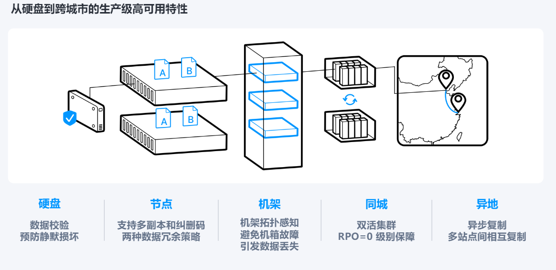 | 超融合基于通用服务器构建,但单节点可靠性正逐渐接近专用存储硬件,用户往往忽略超融合通过分布式集群架构(如多副本、纠删码、虚拟机高可用 HA)实现的整体高可用性。 SmartX 作为国内少有的分布式存储完全自主研发的超融合厂商,基于其构建的企业云平台可提供从磁盘到跨异地数据中心级别的全面数据保护。 –磁盘级保护:每 8KiB 数据存放 512B 校验信息,系统周期性数据巡检,一旦发现错误,自动触发数据恢复。以避免副本降级(尤其是冷数据的副本降级)带来的风险。 –节点级保护:支持使用多副本和EC 技术提供数据冗余,一份数据会在不同的主机上保存多个副本,以提高数据的可靠性和安全性。 –机架感知:支持机架感知功能在集群规划时,把服务器均匀分布到不同的机架中,从而尽量使数据的多个副本均匀地分配到不同机架和机箱的主机上,进一步降低集群故障域。 –SMTX 备份与容灾:支持全面的备份容灾方案,包括数据备份、多数据中心复制等,保障数据的安全。 –SMTX OS 双活:支持 RP0=0 的同城双活数据中心,保障业务访问的连续性。 |