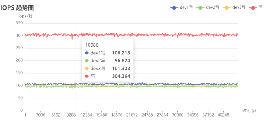 上图为三节点集群的性能压测,其中 dev1、dev2、dev3 曲线表示三个节点的压测性能,红色曲线表示整个集群的性能。曲线抖动越小表示集群性能越稳定。