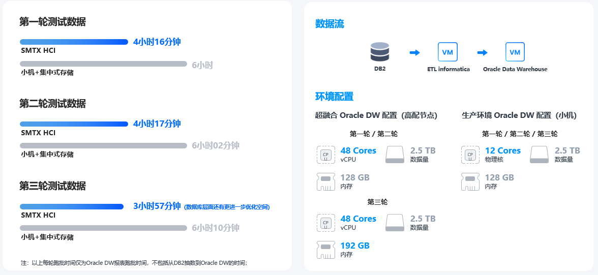 - 经过多轮测试验证,SmartX 超融合架构相比原生产架构的小机 + 集中式存储,在进行 Oracle 数据仓库跑批时有明显的性能提升,跑批时间可有效缩短 36%,并得到客户认可。