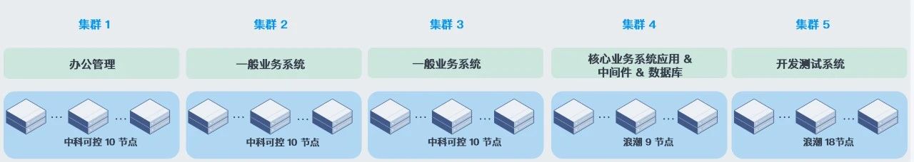 该客户首先基于海光平台和 SmartX 超融合软件构建了底层资源池,并向上完成了与麒麟操作系统、南大通用数据库,以及东方通中间件的适配,构建起完整的信创云基础设施环境。根据内部的业务类型,该机构共构建了五个集群,以 50+ 节点承载邮件、OA、一般业务与核心业务系统。