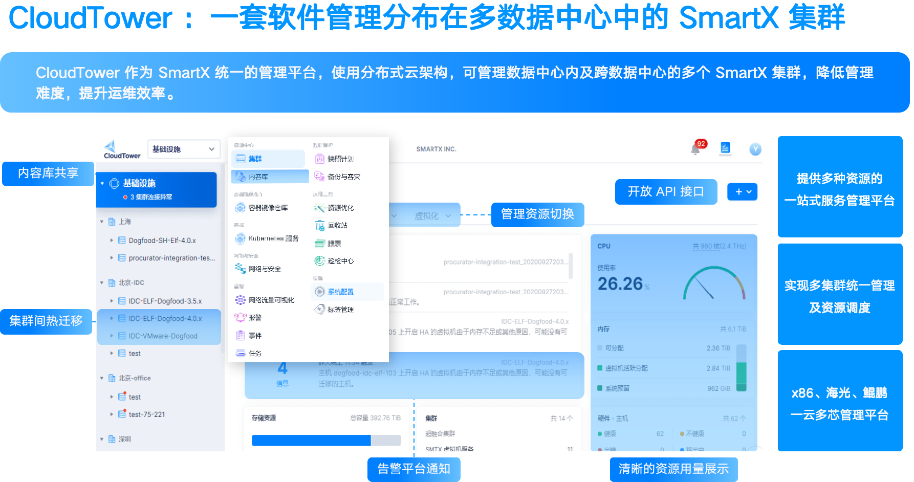 - 统一运维管理:多数据中心多个集群可统一管理,运维管理简单,具备远程集群维护功能(如硬盘更换、版本升级、亚健康检测、智能巡检等)和云基础要素标准化功能(如 ISO 镜像、虚拟机模板等)。