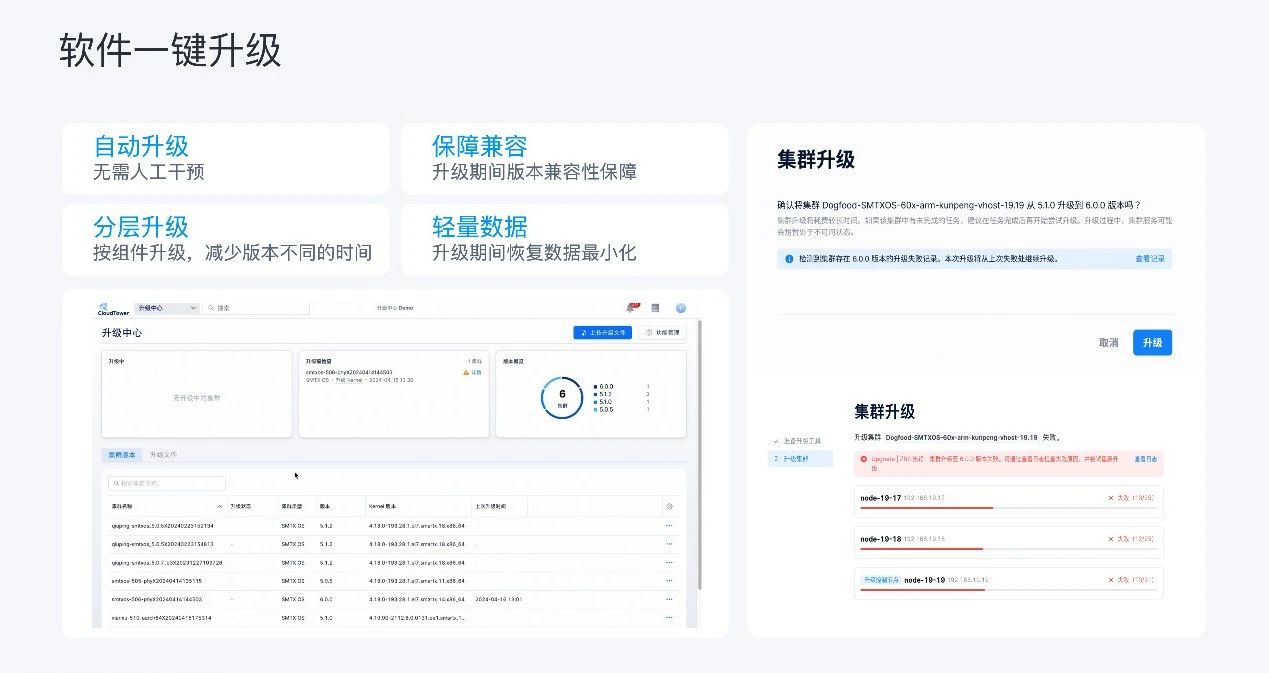 | 榫卯企业云平台洞察用户需求,持续优化与迭代,完全开放解耦,支持一体机交付和纯软件交付方式,并可以部署在一个集群中,以满足不同的企业信息化建设规划和采购需求。 1. 软硬件解耦 –硬件解耦:兼容适配国内外主流品牌和主流型号的标准服务器,无硬件绑定风险。 –芯片兼容:兼容 Intel x86、海光 C86、鲲鹏 ARM、飞腾 ARM、龙芯、兆芯等处理器。同时,支持不同芯片服务器构建的资源池统一管理。 –虚拟化兼容:兼容 VMware 、Citrix 虚拟化,同时支持原生虚拟化 ELF(基于KVM 内核深度开发)。 –小规模起步:超融合架构下最小 3 节点(服务器),即可构建一个轻量企业云全栈功能资源池。 2. 灵活按需扩容 –部件级扩容:支持根据业务需求为服务器扩容网卡、缓存盘、数据盘、内存。例如:在单一节点上,当想对存储扩容时,可以单一磁盘粒度进行扩容,而且不要求同品牌/同型号/同容量(需要符合稳定性一致要求,如对于 SSD,建议采用 DWPD=3)。 –服务器级扩容:支持现有超融合集群最小扩容 1 台服务器,在符合稳定性要求的前提下,不限制服务器品牌和型号。例如:因硬件迭代更新和采购周期影响,不同品牌的海光 2 号和海光 3 号服务器在混合部署。 –计算资源扩容:当计算资源不够时,SmartX 支持只扩容计算节点(3 节点起),使用超融合集群中的富裕存储资源,在灵活性的基础上,最大化地降低客户综合成本(硬件服务器)。 –裸金属服务器扩容:针对高性能 Kubernetes 、GPU 算力资源需求时,支持最小 1 台服务器构建裸金属资源池(建议≥3台)和扩容裸金属服务器。例如:DeepSeek 场景探索阶段 1 台 GPU 服务器即可进行场景模拟。 |