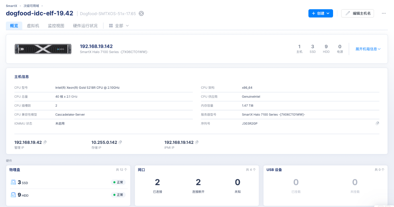 受芯片产能、建设周期等诸多因素影响,集群中包含了不同代数的 CPU(如海光 3 号 / 4 号)和不同品牌型号的服务器(如浪潮、联想、长城天宫、超聚变)。SmartX 帮助用户将跨代硬件平滑扩容至已有资源池,真正实现了以超融合按需构建信创云资源池,屏蔽了底层硬件的差异性。