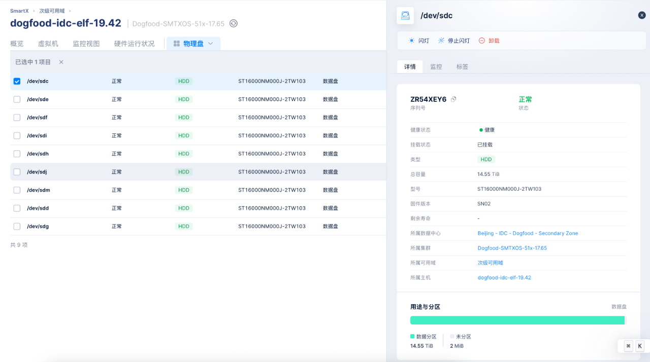 由于用户异地灾备机房为 IDC 托管机房,本地没有过多的 IT 资源投入,用户在使用榫卯企业云平台之前,在运维过程中面临磁盘更换时难以快速准确定位到需要更换的磁盘、快速进行硬盘更换工作等问题。榫卯企业云平台支持通过 Web UI 对磁盘进行闪灯操作,帮助用户快速锁定目标磁盘,并通过图形化界面执行磁盘卸载、挂载等操作,方便快捷,有效解决用户原有运维难点。