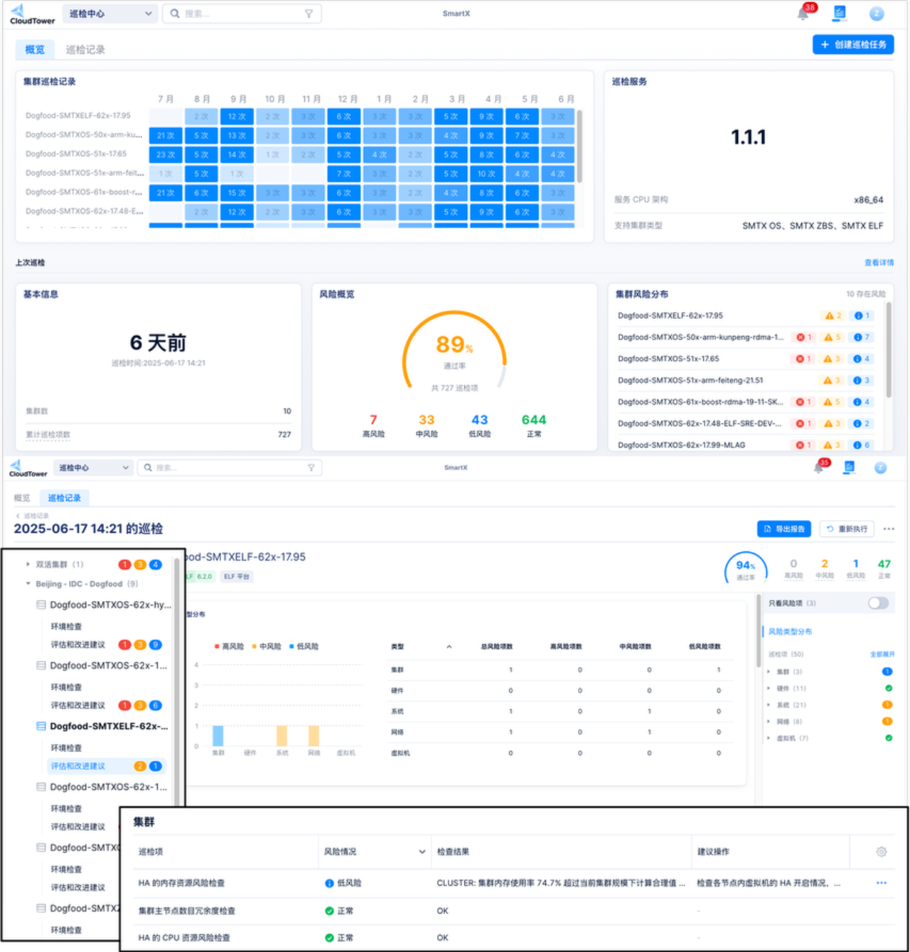 目前,用户在主数据中心通过 CloudTower 实现了多数据中心多集群的统一运维管理。SmartX 异地灾备集群上线至今,用户已远程完成多次版本升级加固、故障硬件辅助更换操作,实现数据中心“零人员值守运维”。
