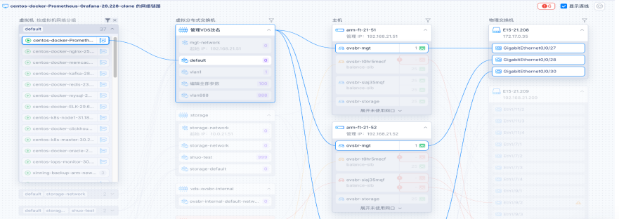 - 榫卯企业云平台也支持网络拓扑展示(包括虚拟机网络、物理网口等),支持 LLDP,可以快速定位资源池中异常的网口数量,并查看网口所在链路,便于用户快速定位并排除故障。