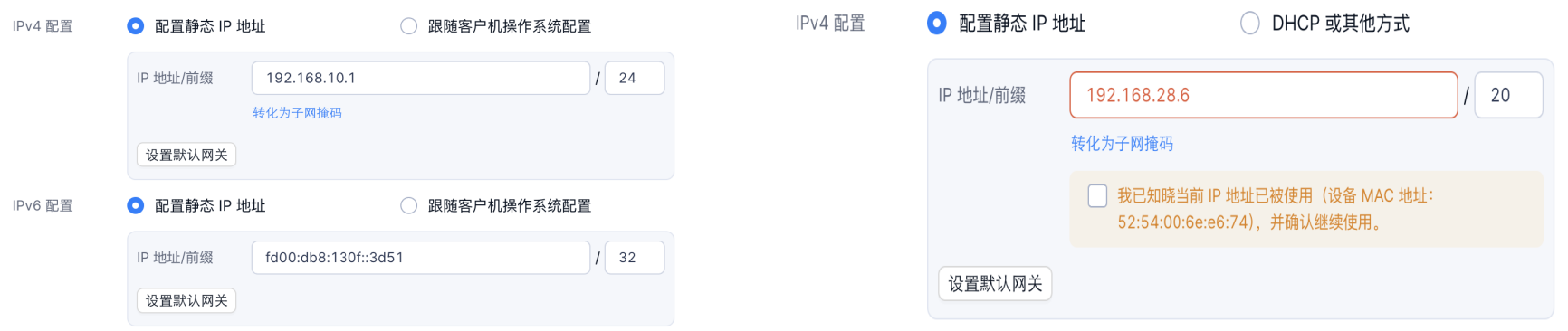 - 云平台环境中,虚拟机数量庞大且变化频繁,误操作或网络配置问题可能导致两个或更多虚拟机使用相同的 IP 地址,导致业务系统服务中断,影响业务系统连续性。榫卯企业云平台具备 IP 冲突检测功能,在配置阶段即给可出提示,帮助管理员提早发现问题。另外,随着 IPv4 地址空间逐渐枯竭,叠加国家标准、行业标准的要求,金融客户纷纷迁移到 IPv6,使用 IPv4/IPv6 双栈网。目前榫卯企业云平台也支持用户通过 WebUI 配置并展示 IPv6 地址,满足用户的多种需求。