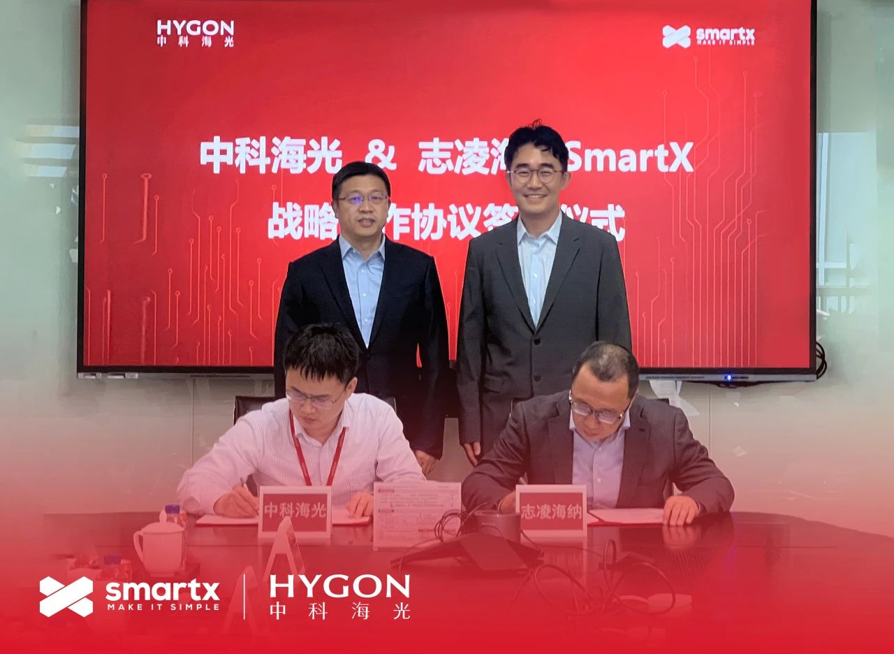 近日,北京志凌海纳科技股份有限公司(以下简称“SmartX”)与海光信息技术股份有限公司(以下简称“海光信息”)在京举行高层会谈,并正式签署战略合作协议。双方将围绕“SmartX 企业云平台”与“海光芯片”展开全方位合作,建立长期、稳定的软硬件协同机制,共同打造面向重点行业的国产化企业云平台解决方案新标杆。