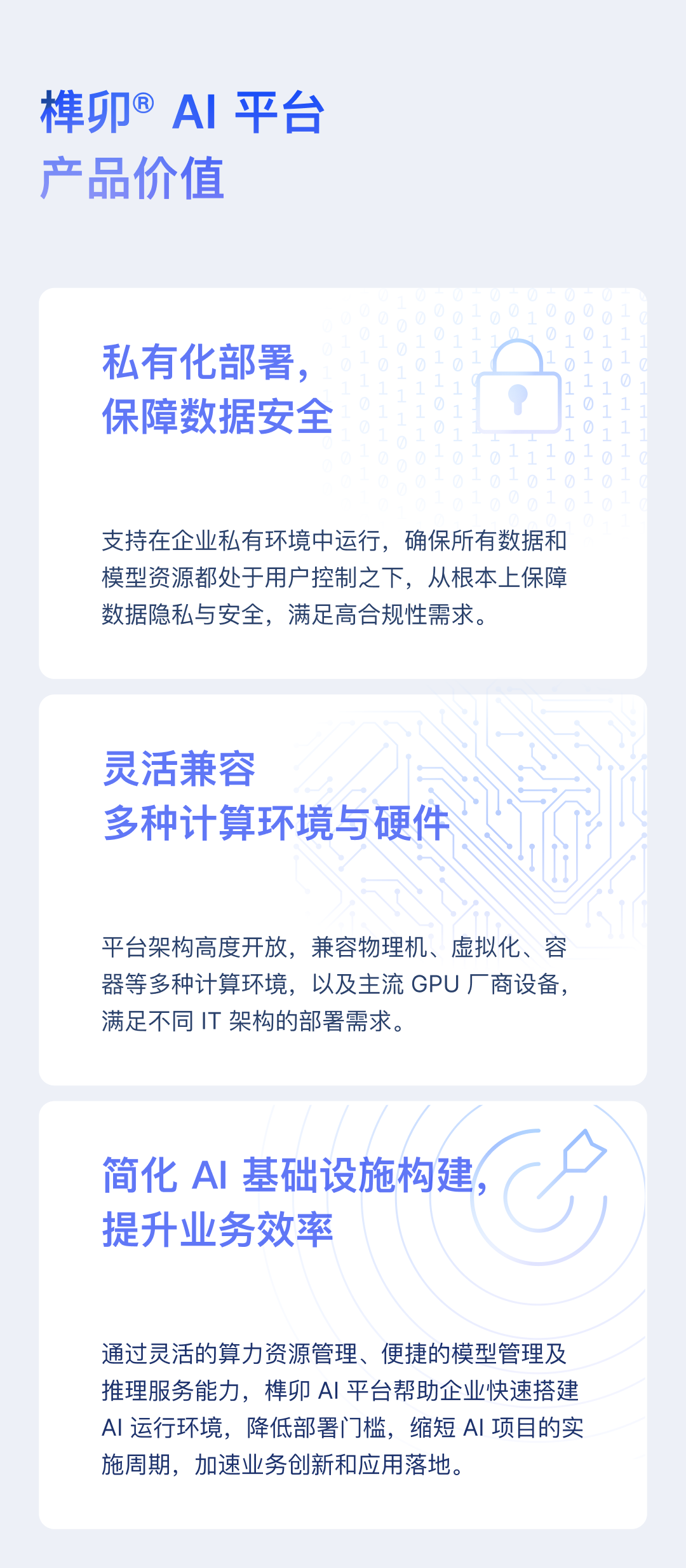 榫卯 AI 平台采用灵活兼容的架构,支持多种运行环境与 GPU 类型,集成模型管理、算力调度、推理服务及权限治理等核心能力,有效提升 AI 基础设施的使用效率与稳定性,降低资源管理复杂度,强化数据与模型的可控性与安全性,为用户提供以下价值: