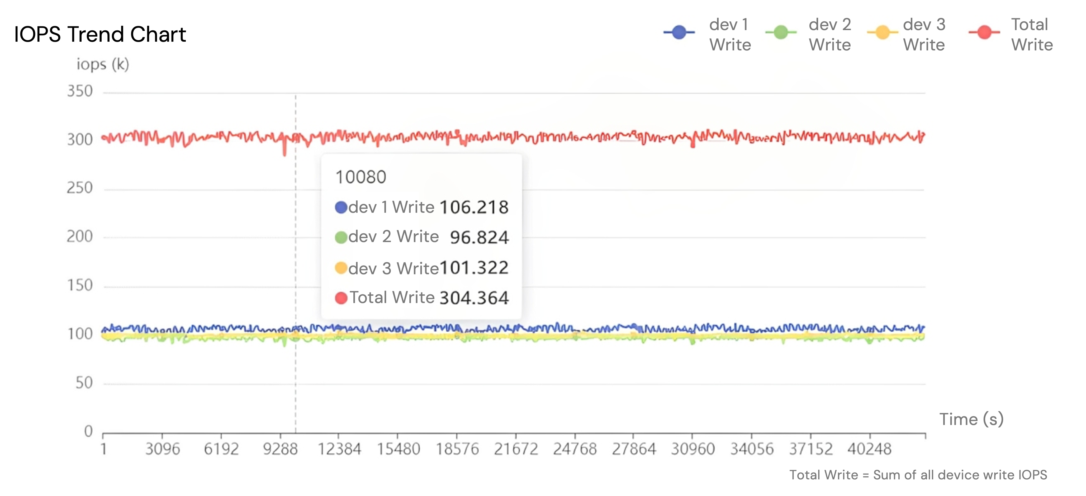 The chart above shows a performance stress test of a three-node cluster. The curves for dev1, dev2, and dev3 represent the performance of each node, while the red curve represents the overall cluster performance. Smaller fluctuations in the curves indicate more stable cluster performance.