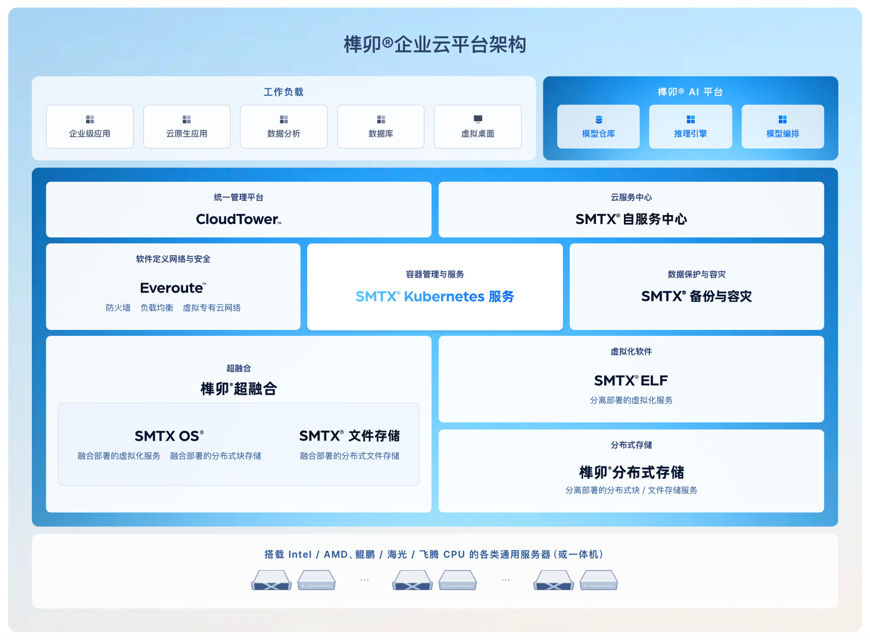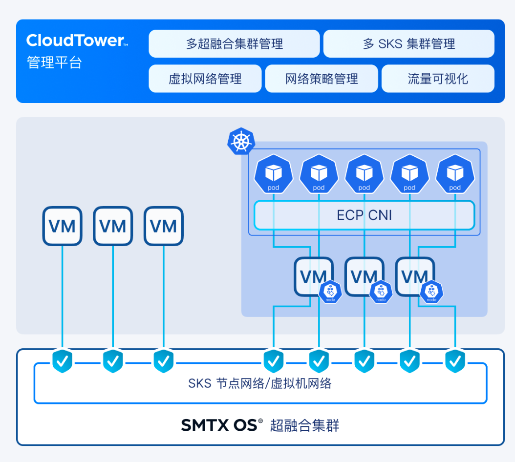 在很长一段时间里,行业对“超融合承载容器”的能力存在诸多质疑,认为其更适合虚拟机场景,无法应对云原生应用的灵活性与复杂性。然而,随着 SMTX Kubernetes 服务(SKS)在多家大型企业落地,这一认知正在逐步改变——SKS 构建在榫卯企业云平台之上,深度融合虚拟化、存储、网络与安全能力,面向多租户、多形态、混合架构的容器化需求,帮助企业构建统一、高效、可控的容器基础设施平台。同时,榫卯企业云平台通过模块化的产品架构和平台原生的容器服务,为容器场景提供全生命周期的支撑能力,彻底打破了“虚拟机 vs 容器”的二元对立,让企业在一个统一架构中同时管理虚拟化与云原生负载。