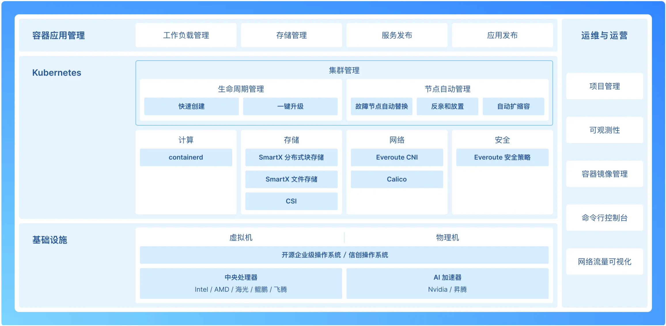| SKS 作为一款构建在自主研发的超融合平台上的容器服务产品,已在多家头部金融、制造和海外客户中落地验证,具备完整的企业级容器平台能力: -SKS 支持虚拟机与物理机混合构建 Kubernetes 集群,结合生产级分布式存储与统一网络安全平台,提供从计算、存储到网络的一体化支撑体系,帮助用户重构基础设施底座。 -SKS 遵循 Kubernetes 开放标准,兼容主流容器生态(如 Rancher、KubeSphere、灵雀云等),不绑定平台组件,支持企业保留原有 DevOps 工具链、监控方案和服务目录,降低切换门槛。 -基于 Cluster API 的自动化能力,SKS 提供了图形化的一键部署、扩缩容、版本升级与故障节点替换等功能,帮助企业快速构建面向生产的集群环境,大幅缩短交付周期,降低运维复杂度。 -SKS 在信创生态下已完成对主流国产芯片、操作系统、数据库的兼容适配,具备良好的落地基础。对于亟需推动信创替代的客户而言,SKS 不仅提供了 Kubernetes 能力,更提供了一个“容器+虚拟化+分布式存储+SDN”的一体化架构,成为企业落地自主可控 CaaS 能力的关键抓手之一。 |