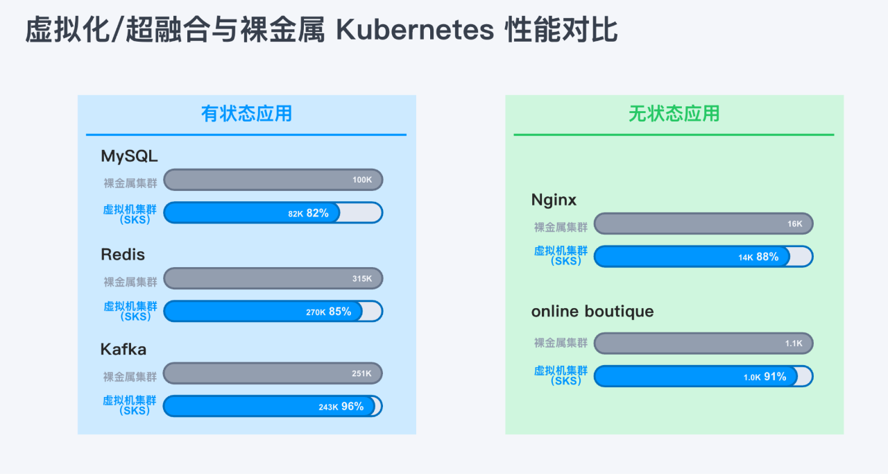 | SKS 提供混合部署模式,允许企业同时使用虚拟机和物理机节点,充分满足不同应用场景的差异化性能需求。在极致性能要求的业务场景中,企业可以选择物理机节点,以避免虚拟化性能损耗,追求最大计算性能。此外,企业也可以充分利用现有旧服务器资源,以物理机形式加入 SKS 集群,优化资源投入和成本管理。SKS 也支持统一平台下物理机和虚拟机 Kubernetes 集群的集中管理,企业可在单一界面完成多种计算资源类型的统一调度与管理。 另外,实际的性能测试结果显示,SKS 虚拟化集群在主流有状态和无状态应用场景中,其性能表现均能达到裸金属 Kubernetes 集群性能的较高比例。例如在有状态应用中,MySQL 性能达到裸金属的 82%、Redis 达到 85%、Kafka 更是高达 96%;无状态应用如 Nginx 达到裸金属的 88%,online boutique 应用达到 91%。 这一测试结果表明,超融合虚拟化的性能损耗已经极小化,足以覆盖绝大多数在线业务的实际需求。而以上性能差距,在享受到更高的资源利用率、故障隔离能力、部署效率之后,反而成为可接受甚至更值得的“成本”。 |