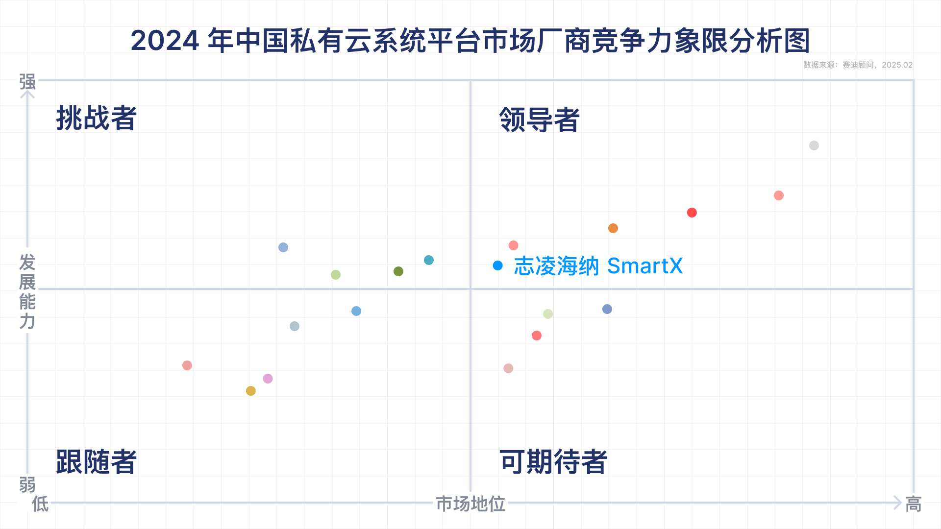 近日,市场咨询机构赛迪顾问发布《2024-2025 年中国私有云市场研究》(以下简称“报告”),围绕私有云市场发展、厂商竞争格局和未来预测建议,对中国私有云市场展开全面分析。志凌海纳 SmartX 凭借灵活、可控、模块化的自建云方案,以及客户在自建云实践中的领先性与创新性场景等优势,入选赛迪私有云系统平台市场领导者象限。