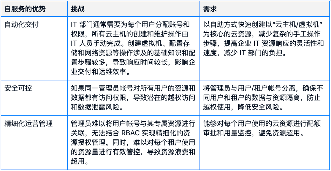 除了日常的基础设施运维工作,不少企业 IT 团队还需要处理来自企业内部各部门的资源/服务申请,以手动的方式进行配置,并确保各部门间数据隔离、互不干扰。这些工作看似“简单”,实则会占用运维人员较多时间精力,尤其是对于人员有限的团队,往往难以同时兼顾并高效完成基础设施运维工作和内部支持工作。