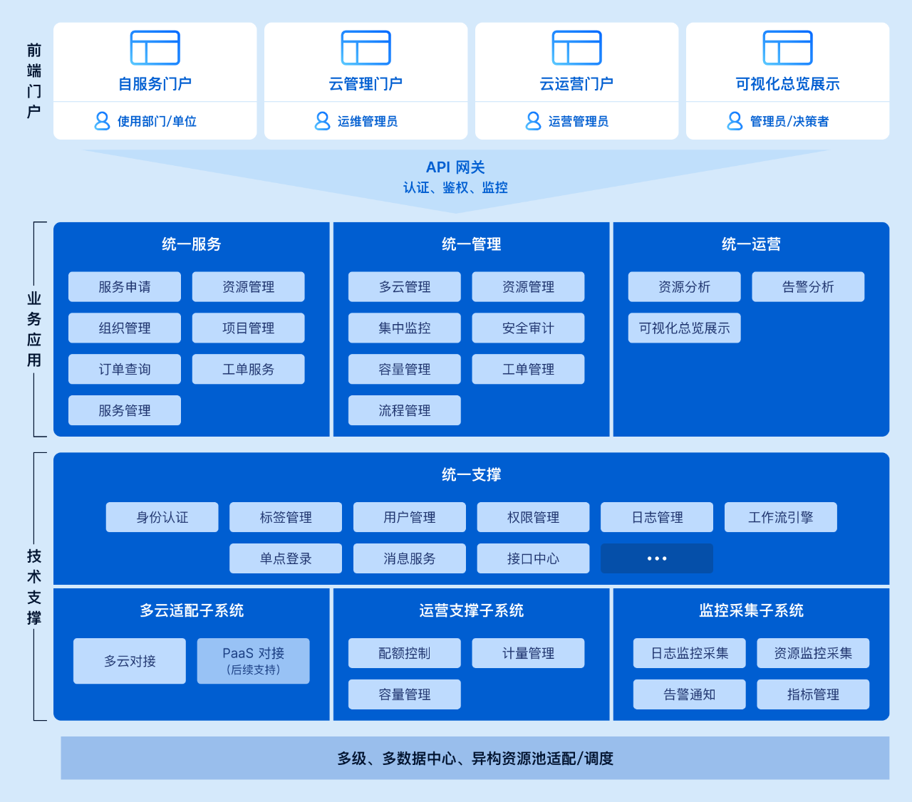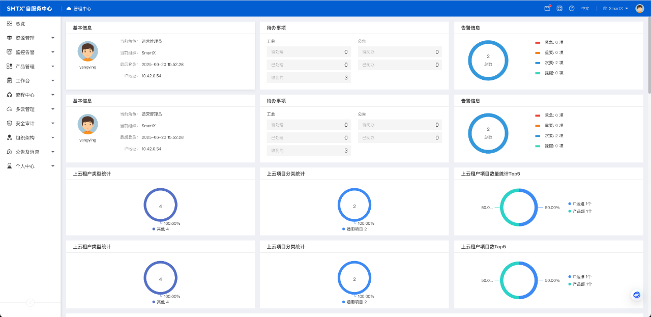 - 统一监控与告警:在一个仪表盘中集中监控所有纳管资源池的健康状态、资源用量 Top5、告警趋势等,快速定位问题。
