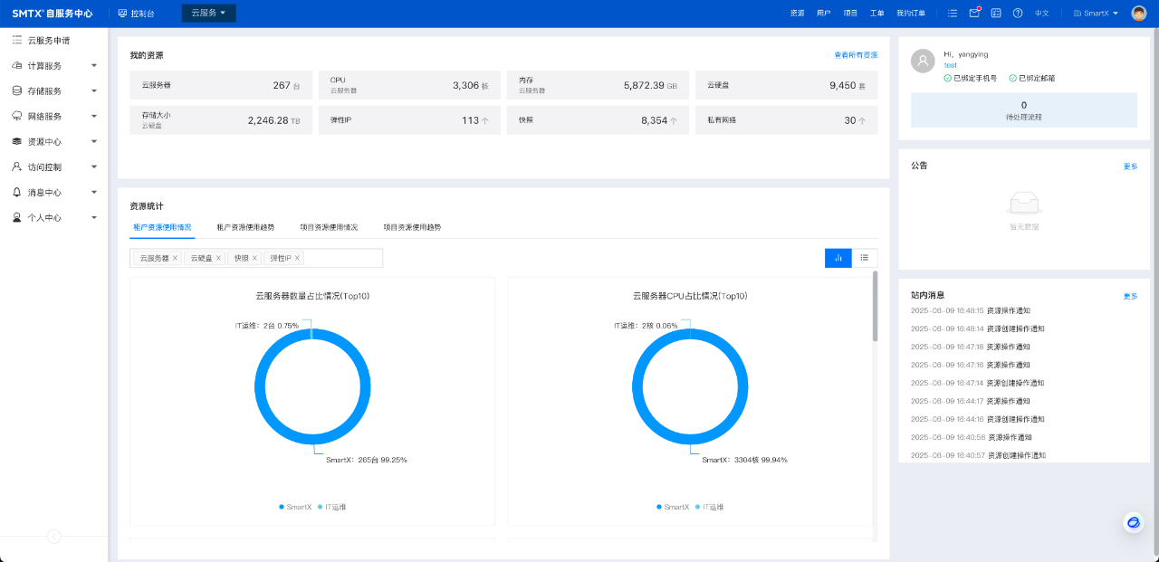 在原 SmartX 方案中,我们提供了灵活开放的 API 接口,支持用户对接主流第三方 CMP 平台,获取统一资源编排、自动化交付等能力。在全新发布的榫卯企业云平台中,我们进一步完善了企业自建云平台管理能力,通过 SMTX 自服务中心(SSC)组件,让企业内部的 IT 用户能够自主、安全地申请和使用云资源,提高资源利用率和业务交付速度,减轻 IT 部门的工作负担。
