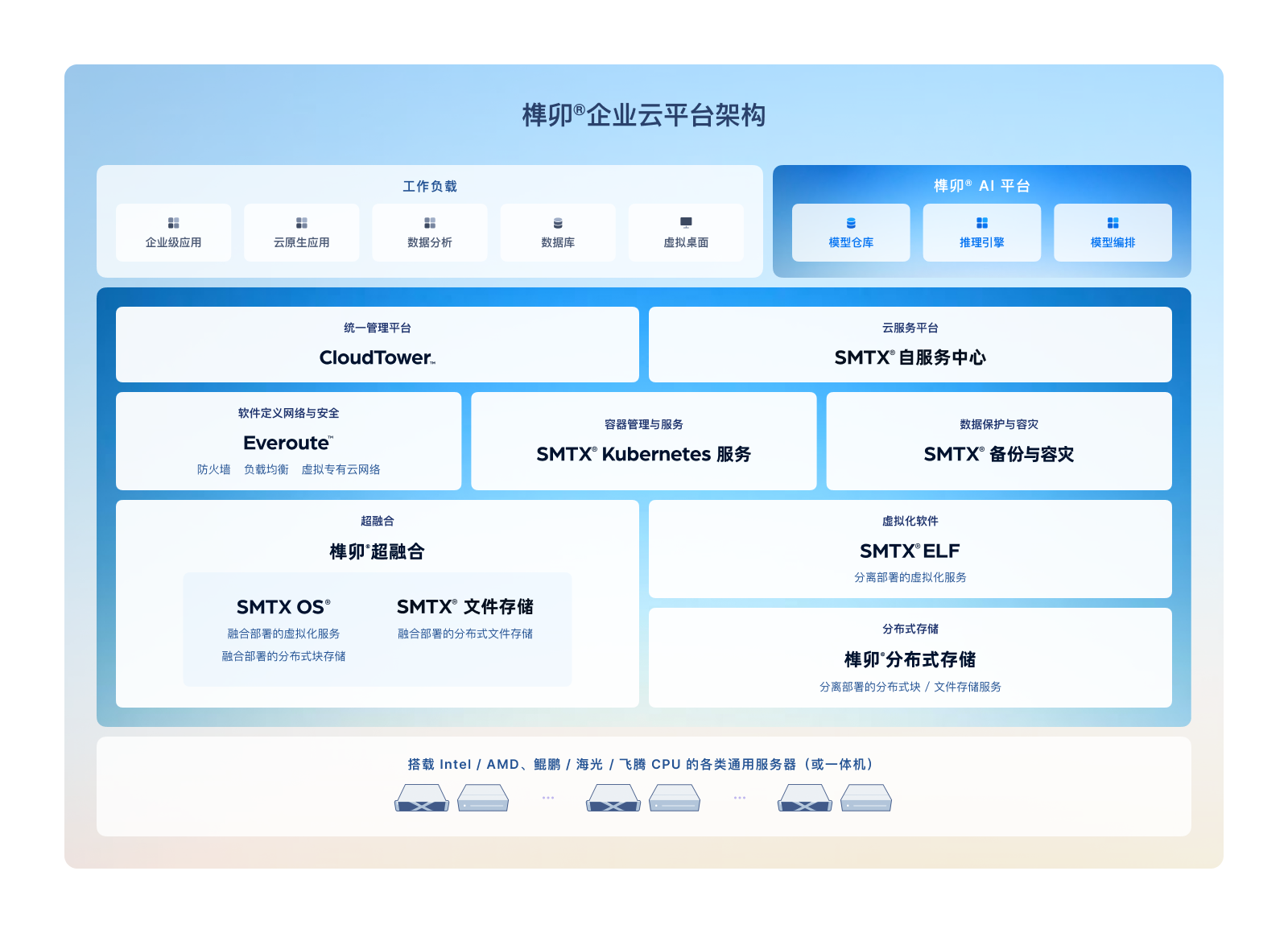 榫卯企业云平台是 SmartX 面向企业自建云需求推出的产品组合。通过灵活、可控、模块化的建设方式,榫卯企业云平台帮助用户以更低的初始投入,按需组合计算、存储、网络、安全、灾备与管理能力,全面支撑传统应用、现代化应用及 AI 应用的落地部署,可覆盖集团数据中心、分支机构与边缘等多种场景,满足企业数智化转型需求的同时,大幅降低建设难度与总拥有成本。