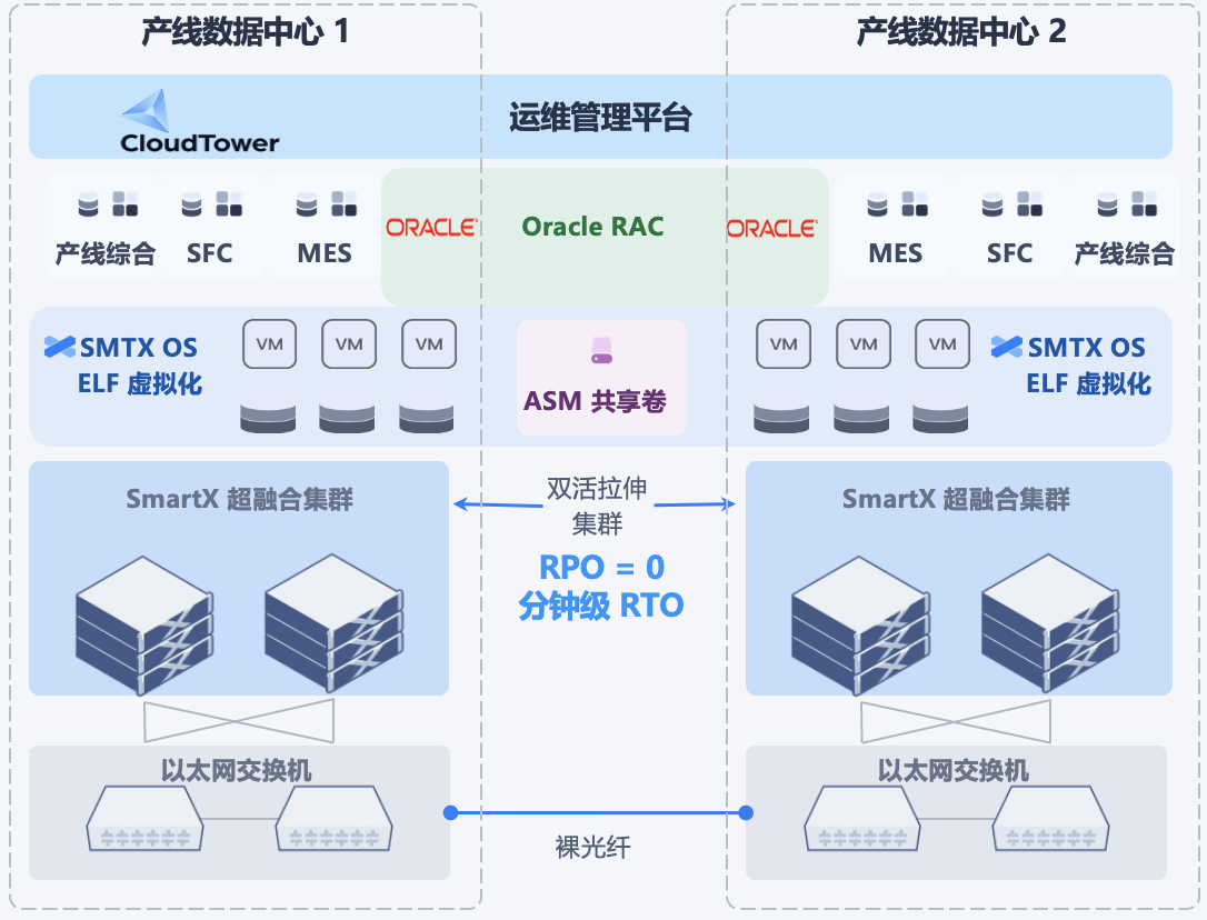 富士康还针对多个产线数据中心构建了基于超融合架构的双活拉伸集群,为 MES 以及对应的 Oracle RAC 数据库、SFC (车间管控系统)以及产线综合系统提供高可用保护。