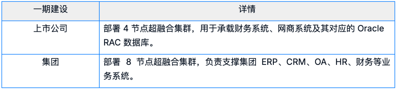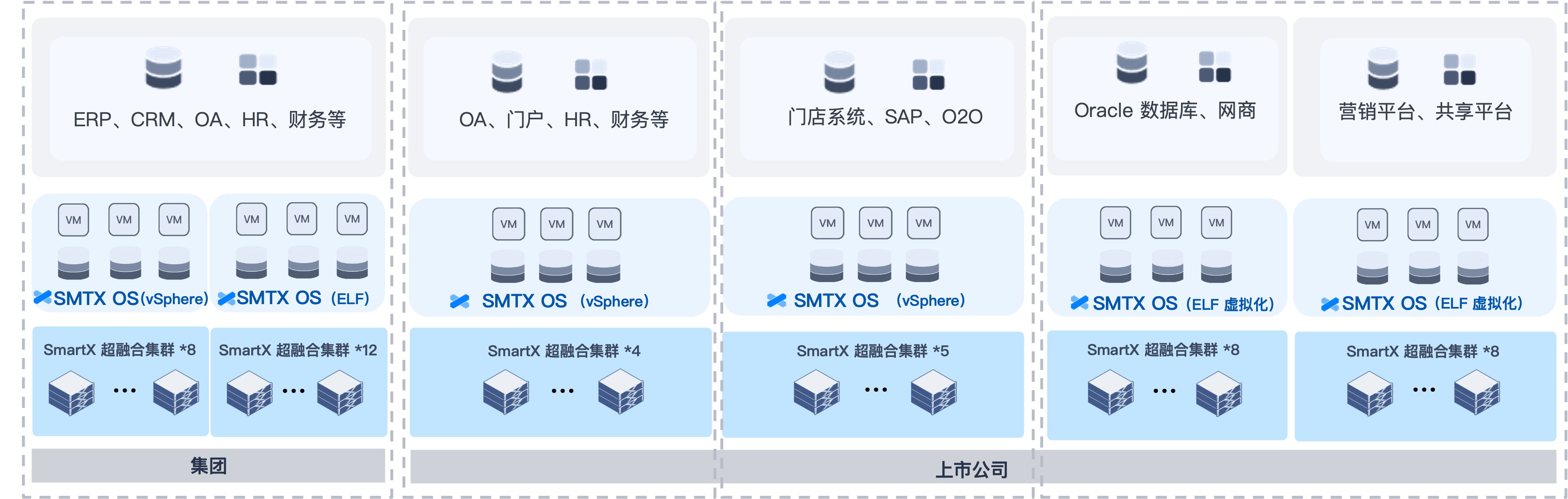 最终,该企业选择使用 VMware vSphere+SMTX OS 的融合部署方式,保留 VMware vSphere 作为计算平台,与 SMTX OS 的分布式存储组合形成榫卯企业云基础设施集群,完成了数据中心架构“从分散到融合”的第一步转型。基于这套方案,企业使用全闪服务器承载了集团和上市公司的核心数据库、财务系统等业务系统。