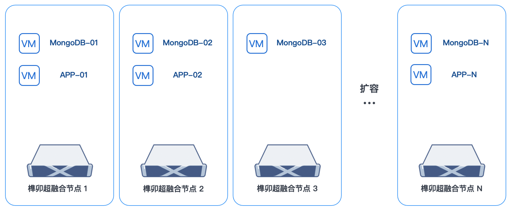 同时,由于安全应用系统部署于 MongoDB 数据库之上,SmartX 超融合架构的 “计算与存储融合、资源池化、按需扩展” 特性,也高度契合 MongoDB 分布式数据库的横向扩展需求。面对业务增长带来的资源需求,用户无需再像使用传统架构那样进行复杂的前期规划和漫长的采购部署,仅需在线添加标准服务器,即可无缝完成横向扩容,提升了业务灵活性。