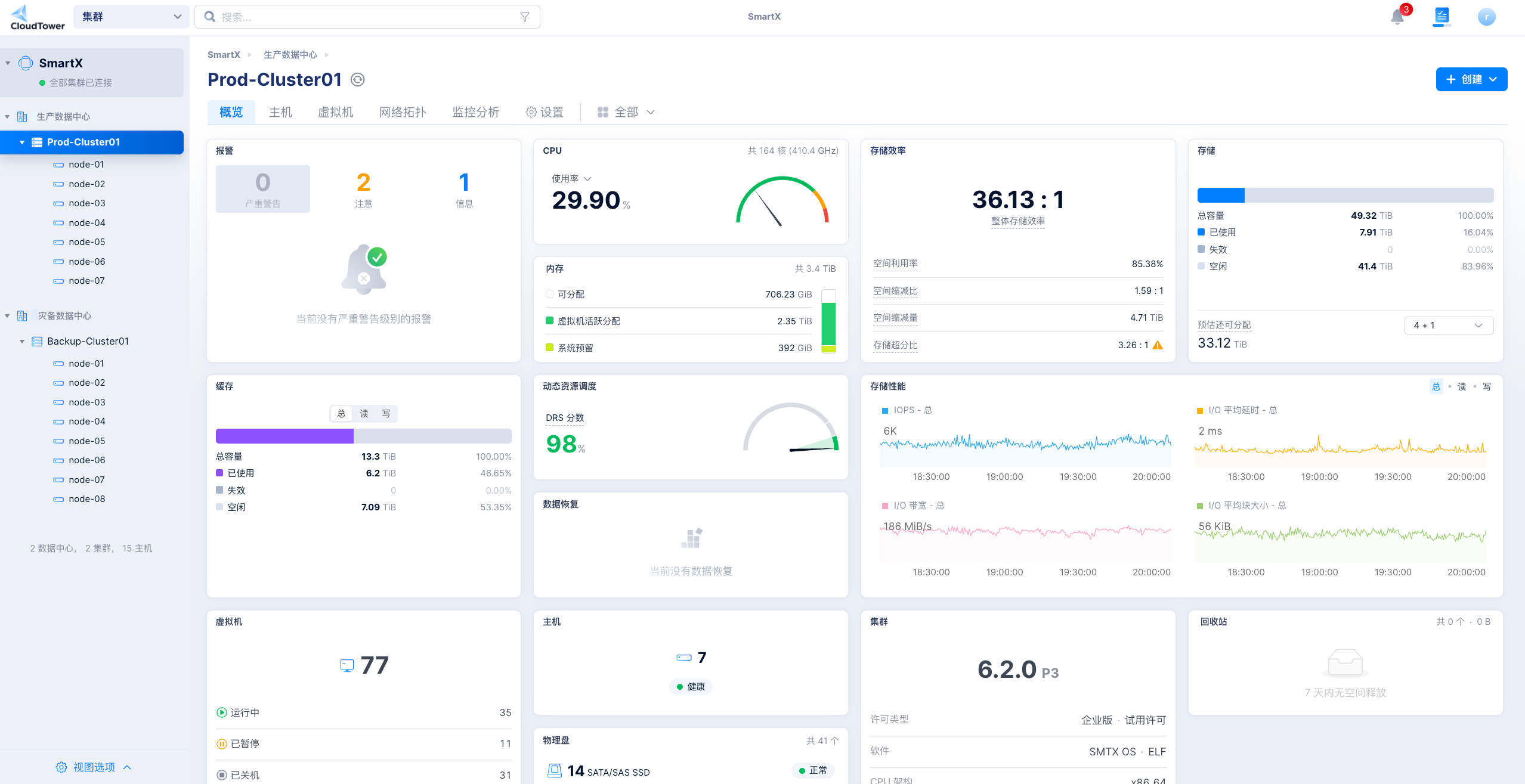而超融合架构的“白屏化”统一管理则实现了“集中管控”,管理员通过单一图形化界面即可完成对所有集群、虚拟机、分布式存储、网络配置以及底层超融合节点的全生命周期管理,显著提升操作效率并降低配置错误风险。