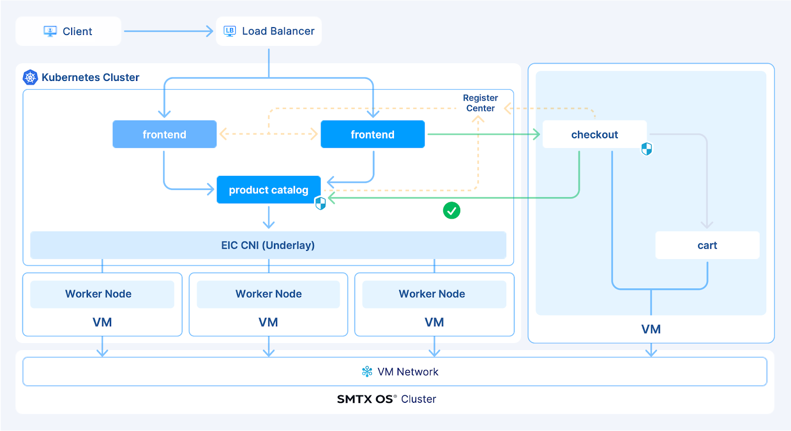 - Integrated CNI for Flat Network: SKS integrates Everoute Integrated CNI (EIC), which uses a flat network design to directly connect Kubernetes pods to the same virtual network as VMs. This avoids overlay network overhead and delivers near-physical network performance.