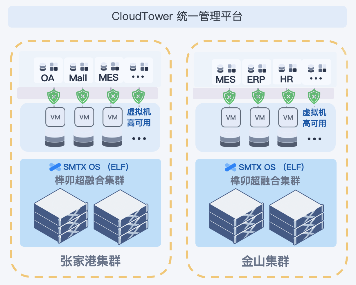 张家港工厂的超融合集群进行了长达近 1 年的业务场景压测与验证,期间陆续承载了包括 ERP 、MES 在内的全部核心业务系统,在保证稳定运行的同时提升资源调度效率 40%。基于此成熟经验,彤程新材料在金山工厂快速完成了SmartX 榫卯超融合的部署,替代 VMware 超融合架构承载 MES、ERP 等核心生产业务系统,并通过统一的管理平台实现张家港、金山两地超融合集群的可视化运维。运维团队可实时监控资源利用率、故障预警、性能趋势等核心指标,将跨地域运维响应时间从小时级缩短至分钟级。