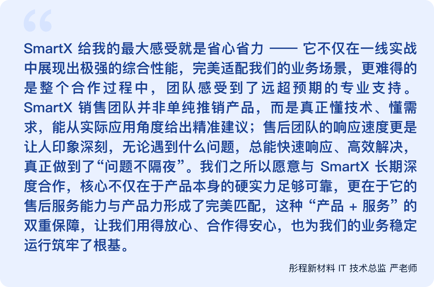 在经过测试验证后,彤程新材料率先在张家港工厂部署了第一批 SmartX 榫卯超融合集群,采用分布式架构构建起支撑生产数据处理、设备监控系统等核心业务的弹性云平台。该区域作为彤程新材料重要的生产基地,日均产生大量工业数据,这套部署方案通过超融合架构实现存储与计算资源池化,在满足实时业务响应需求的同时,较传统 VMware 虚拟化+集中式存储方案整体节省不少的硬件投入,为后续集团范围内的 IT 架构升级提供了可复用的实践样本。