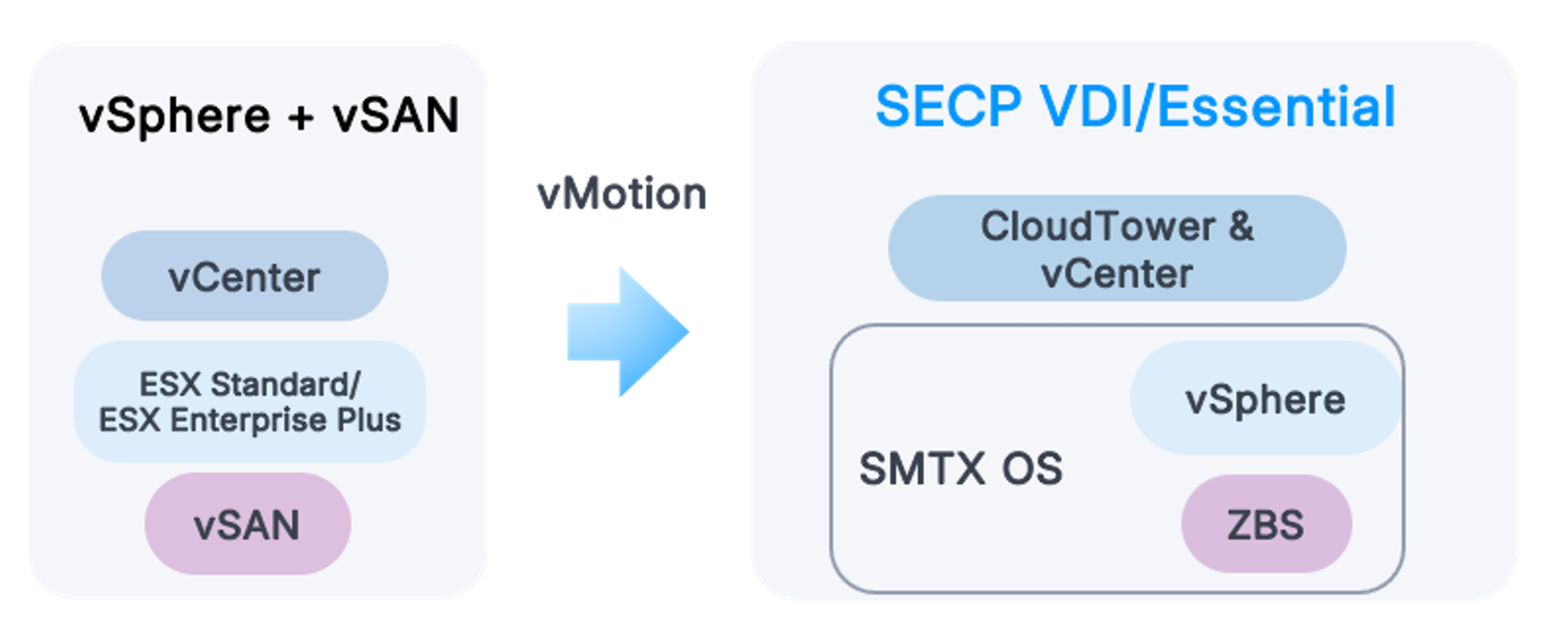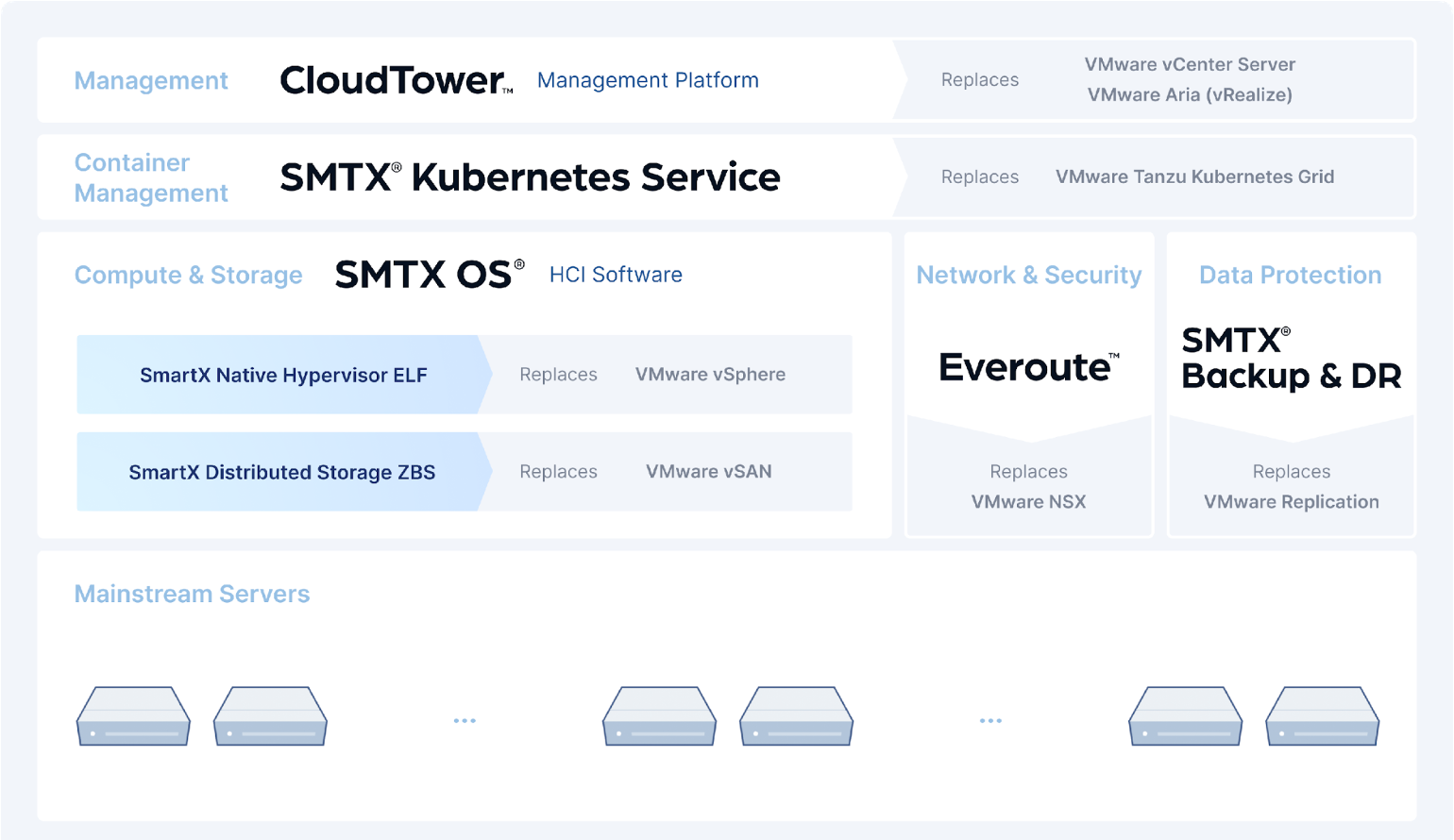 The SmartX ECP Essential — featuring its native hypervisor ELF and distributed storage ZBS — can fully replace VMware virtualization and centralized storage. The multi-cluster management platform CloudTower serves as a replacement for vCenter.