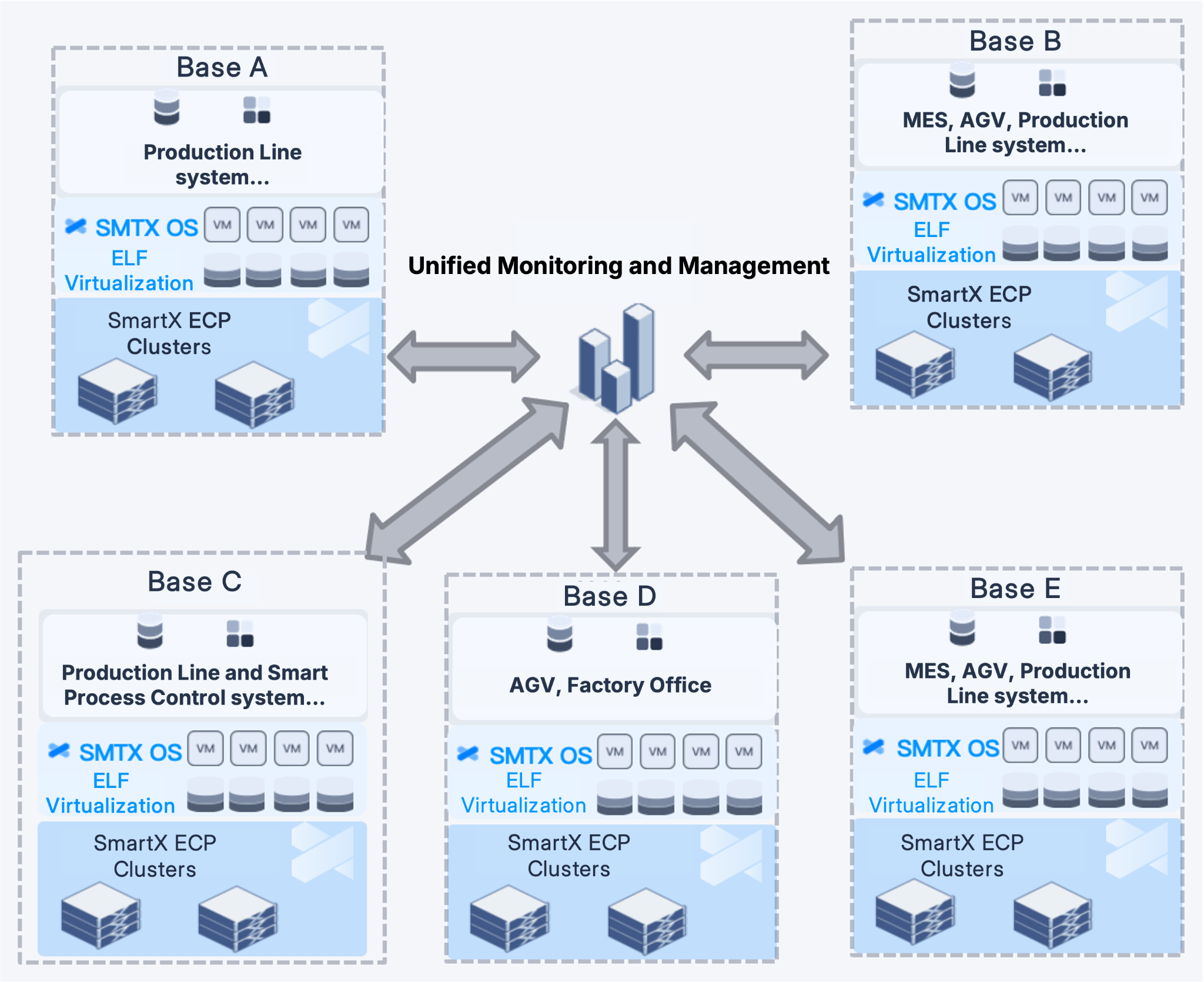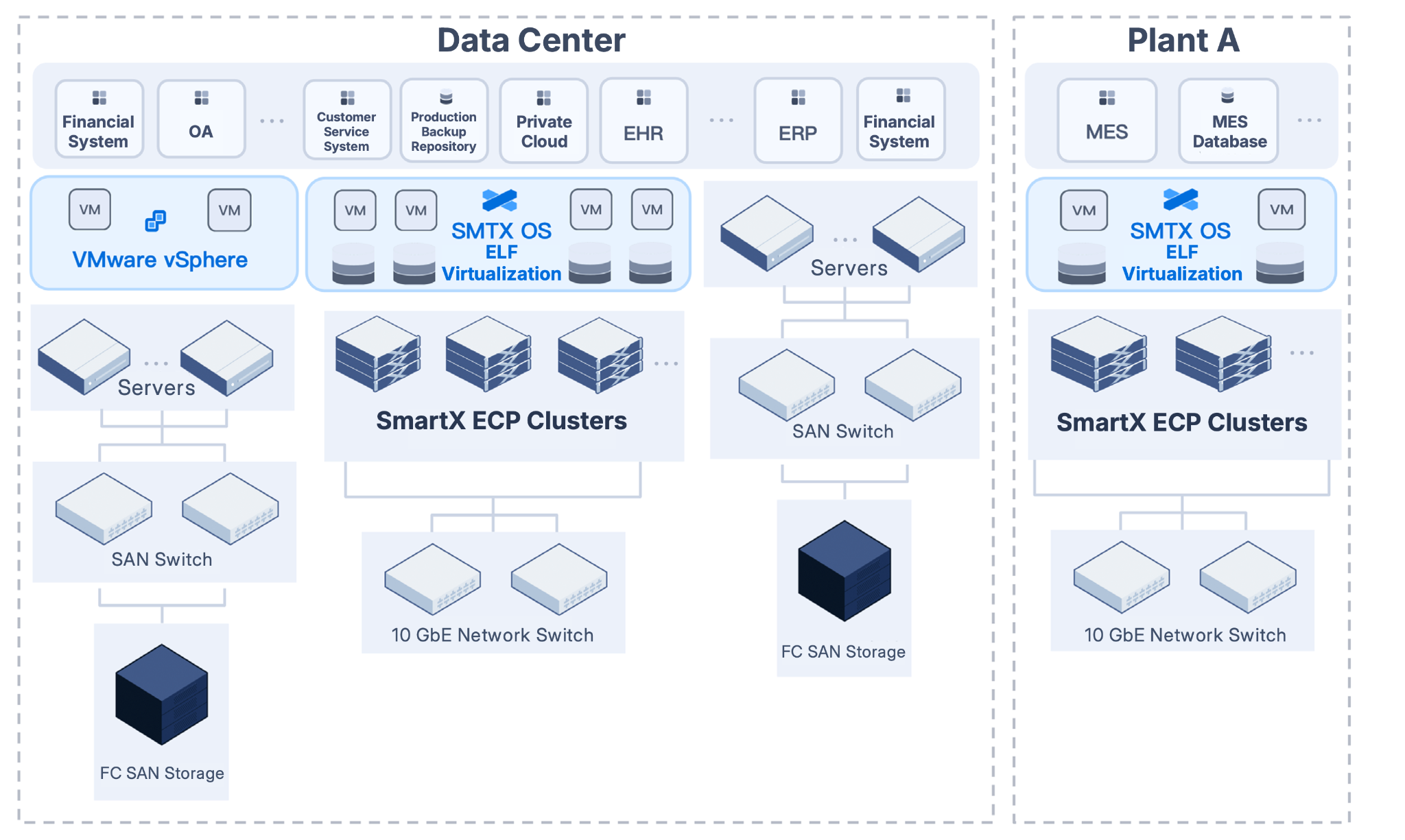 As a full-stack enterprise infrastructure solution, SmartX ECP provides a more stable, secure, and intelligent foundation for manufacturers, supporting five key use cases: building an enterprise cloud with full-stack capabilities, supporting core applications such as MES and ERP, ROBO, VMware/Nutanix replacement, and Dev/Test with VDI.