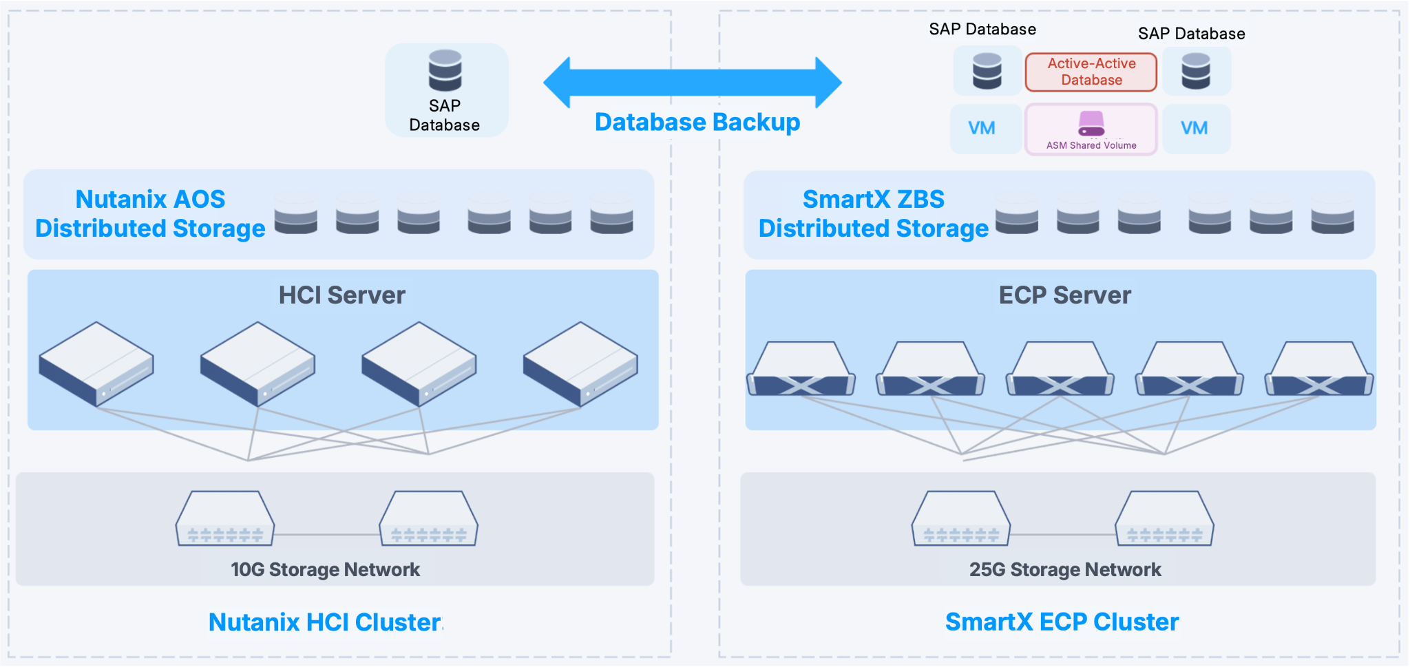 Jiuli Group replaced Nutanix HCI with SmartX ECP to host its SAP systems and databases. Business continuity is ensured through an active-active architecture plus data backup: while the SmartX ECP cluster serves the SAP primary database, the data is simultaneously replicated to the Nutanix cluster, which functions as the standby system.