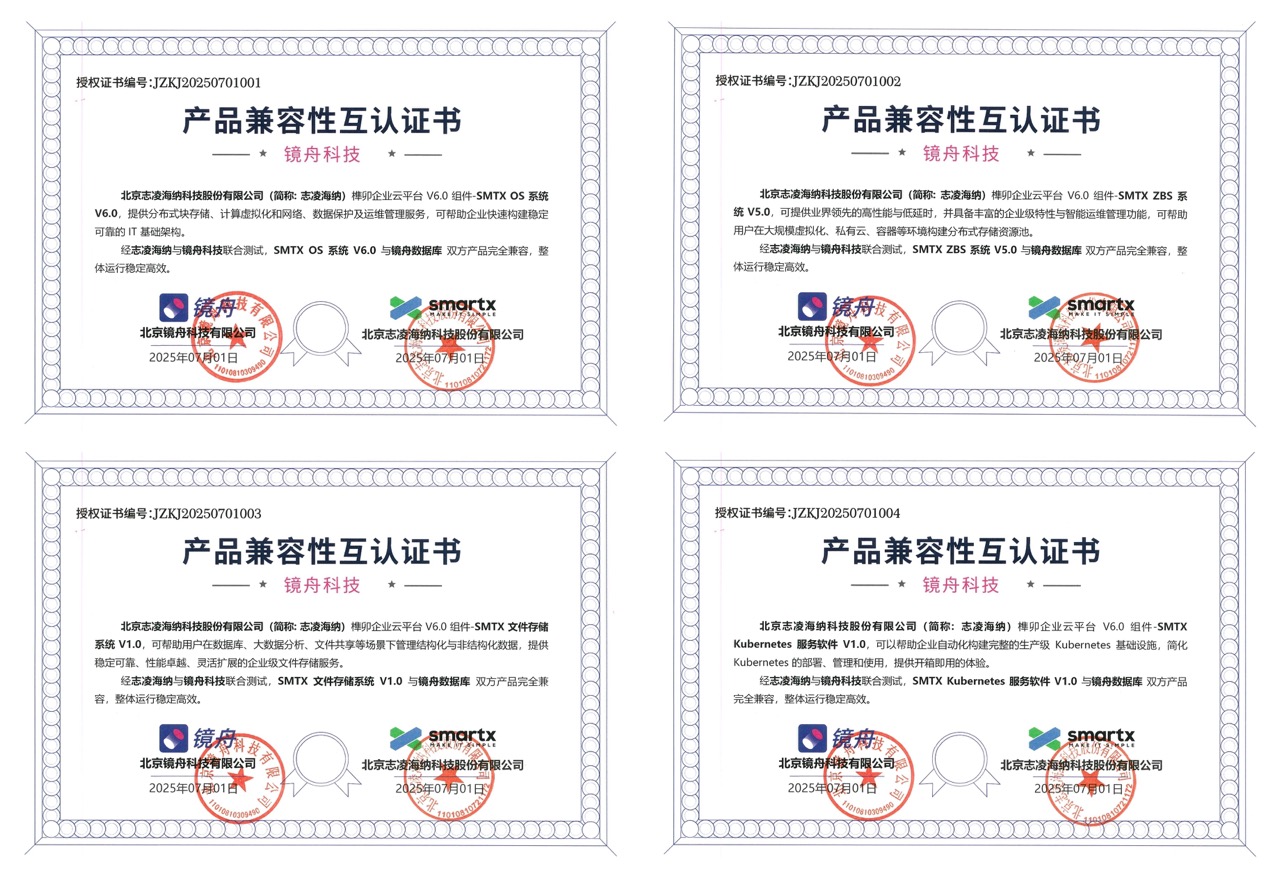 近日,北京志凌海纳科技股份有限公司(以下简称“SmartX”)与北京镜舟科技有限公司(以下简称“镜舟科技”)顺利完成产品兼容性认证。经严格测试,镜舟数据库与 SmartX 榫卯企业云平台的关键组件 —— 包括超融合软件 SMTX OS、分布式存储软件 SMTX ZBS、SMTX 文件存储系统以及 SMTX Kubernetes 服务软件 —— 实现了良好的兼容。