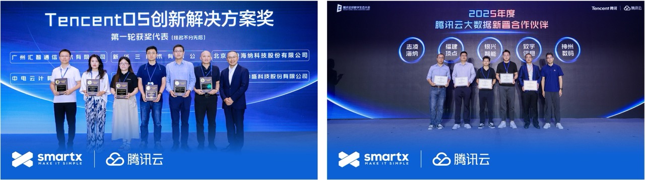 9 月 16-17 日,2025 腾讯全球数字生态大会在深圳举行。北京志凌海纳科技股份有限公司(以下简称“SmartX”)作为腾讯云重要生态合作伙伴受邀出席,并凭借与腾讯云的企业云全栈联合方案,获得“2025 年度 Tencent OS 创新解决方案奖”,和 “2025 年度腾讯云大数据新晋合作伙伴”授牌。
